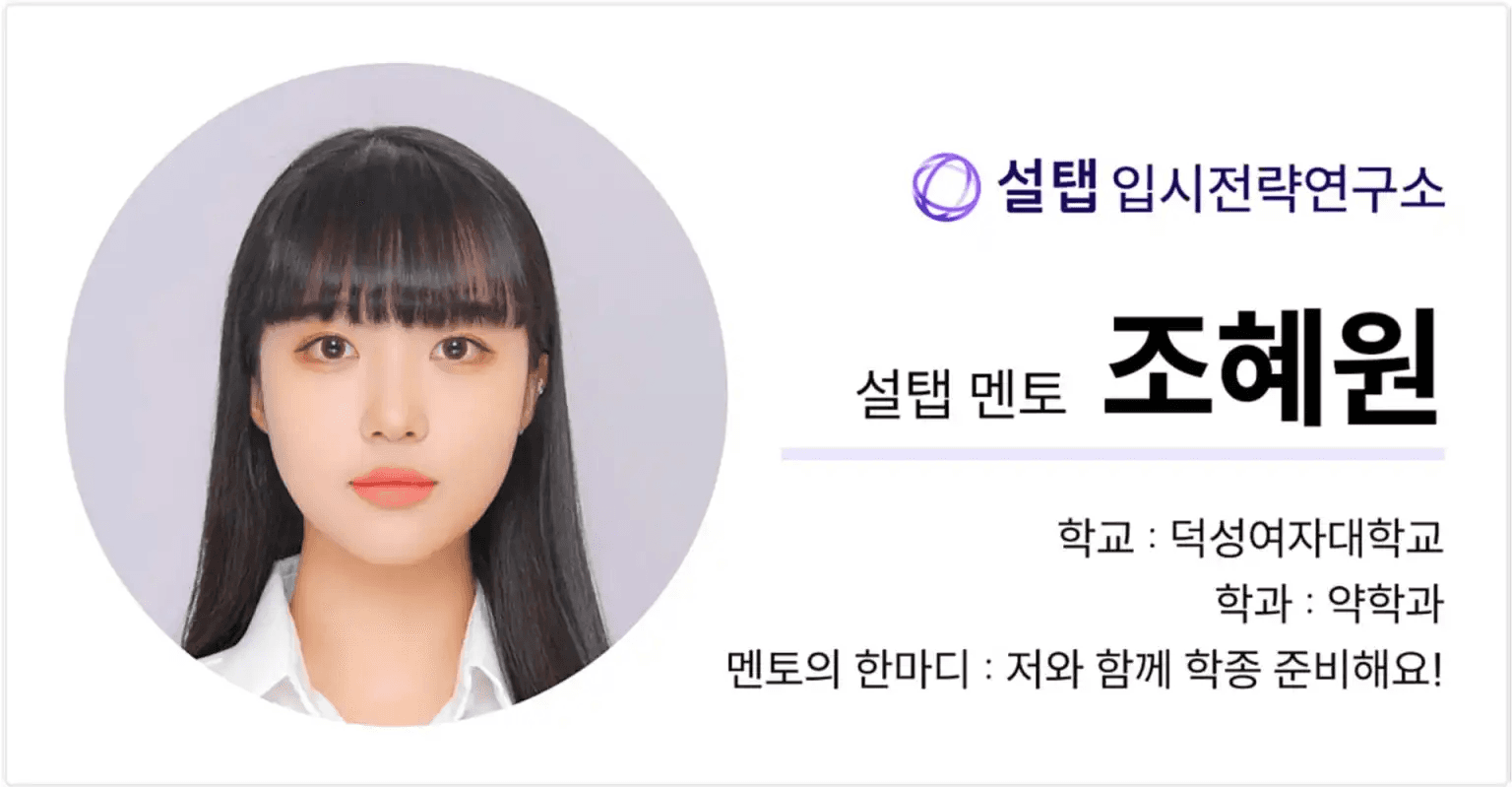 안녕하세요! 저는 덕성여자대학교 약학과에 재학 중인 조혜원 멘토입니다.🙂