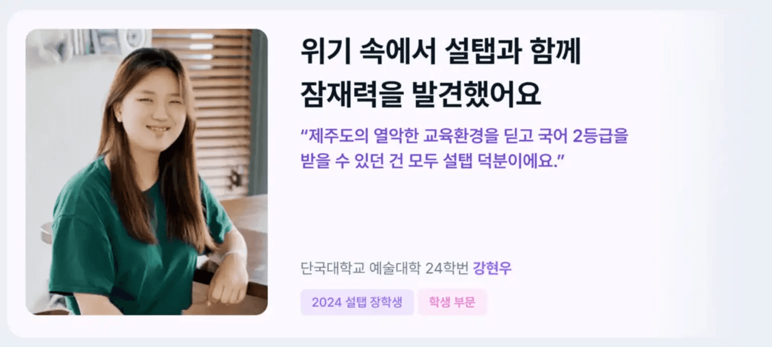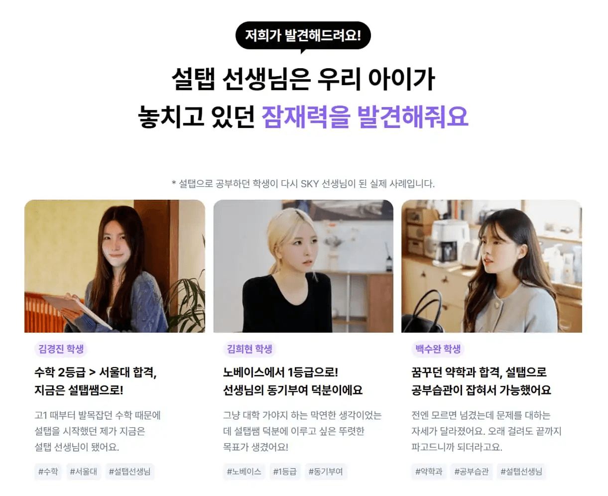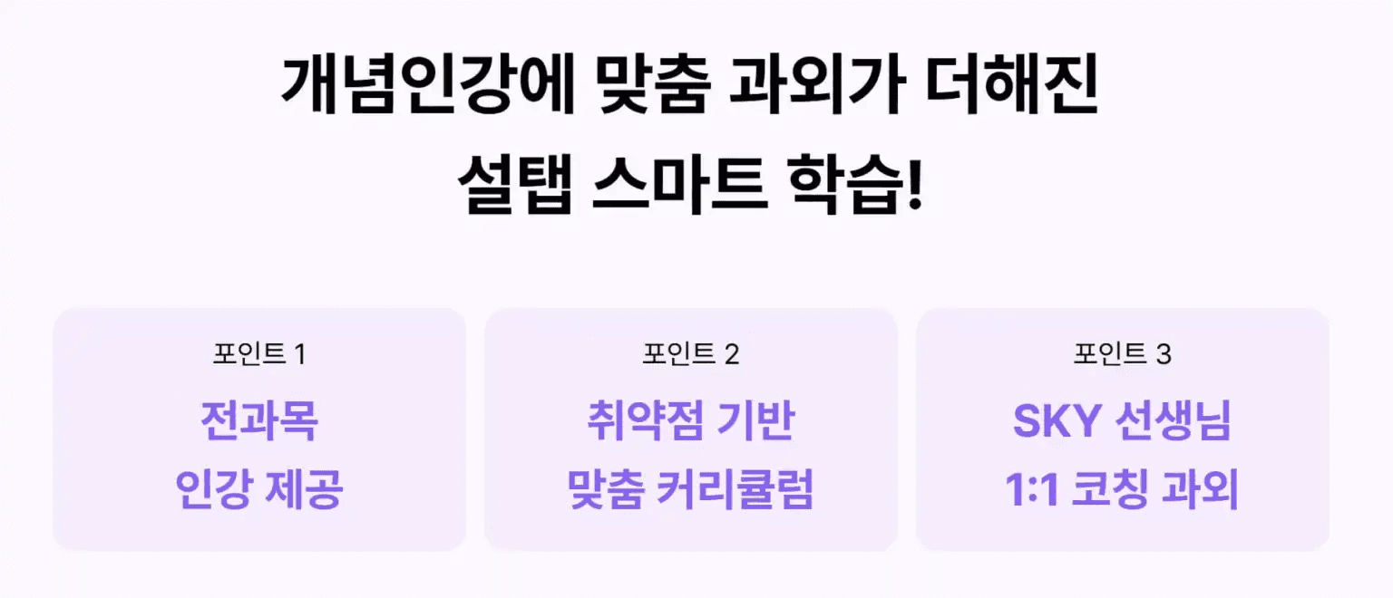 무엇보다 설탭은 탄탄한 개념 정리를 기반으로 한 교과 수업으로 효율적으로 성적을 향상시킬 수 있게 해주는데요. 1:1 비대면 과외로 어디서나 전과목 수업을 받아볼 수 있으며 국영수 인강을 무제한 제공하기 때문에 바쁜 학생들에게 든든한 조력자가 될 거예요.