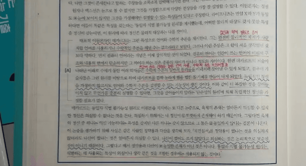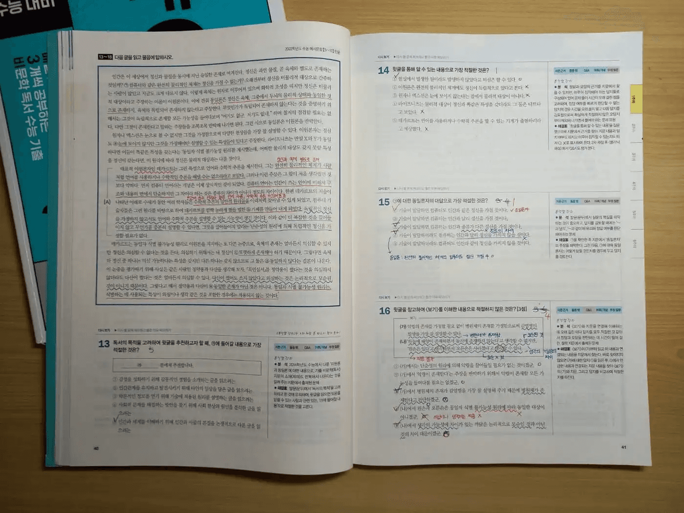 정원 쌤 | “어릴 때부터 책을 많이 읽고 국어적으로 감이 있는 친구들은 지문을 읽으면 곧바로 머릿속에 구조화가 되겠지만 그렇지 않은 친구들이 훨씬 많잖아요. 저는 그 노하우를 윤지에게 설명했어요. 지문을 읽을 때 어떤 단어에 동그라미를 치고 어디에 밑줄을 쳐야 하는지 명확히 알고, 처음부터 끝까지 어떤 흐름으로 이어지고 어디에 중요한 내용이 들어있는지 빠르게 파악하도록요. 최소한 그것만 확실히 해주면 머릿속에 개념이 빨리 들어온다는 걸 알려주고 싶었어요.”
