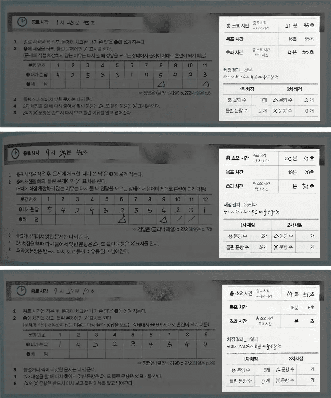 윤지가 처음 설탭을 시작할 때 가장 문제 삼고 있던 국어 문제 풀이 시간 단축을 위해 정원 쌤은 ‘매일 시간을 측정하면서 문제집을 풀고 오답을 체크해보자’고 조언했어요. 윤지가 숙제를 풀어오면 중요한 지문이나 자주 나오는 작품, 반복적으로 틀리는 문항을 더 자세히 해설해 주셨고요.