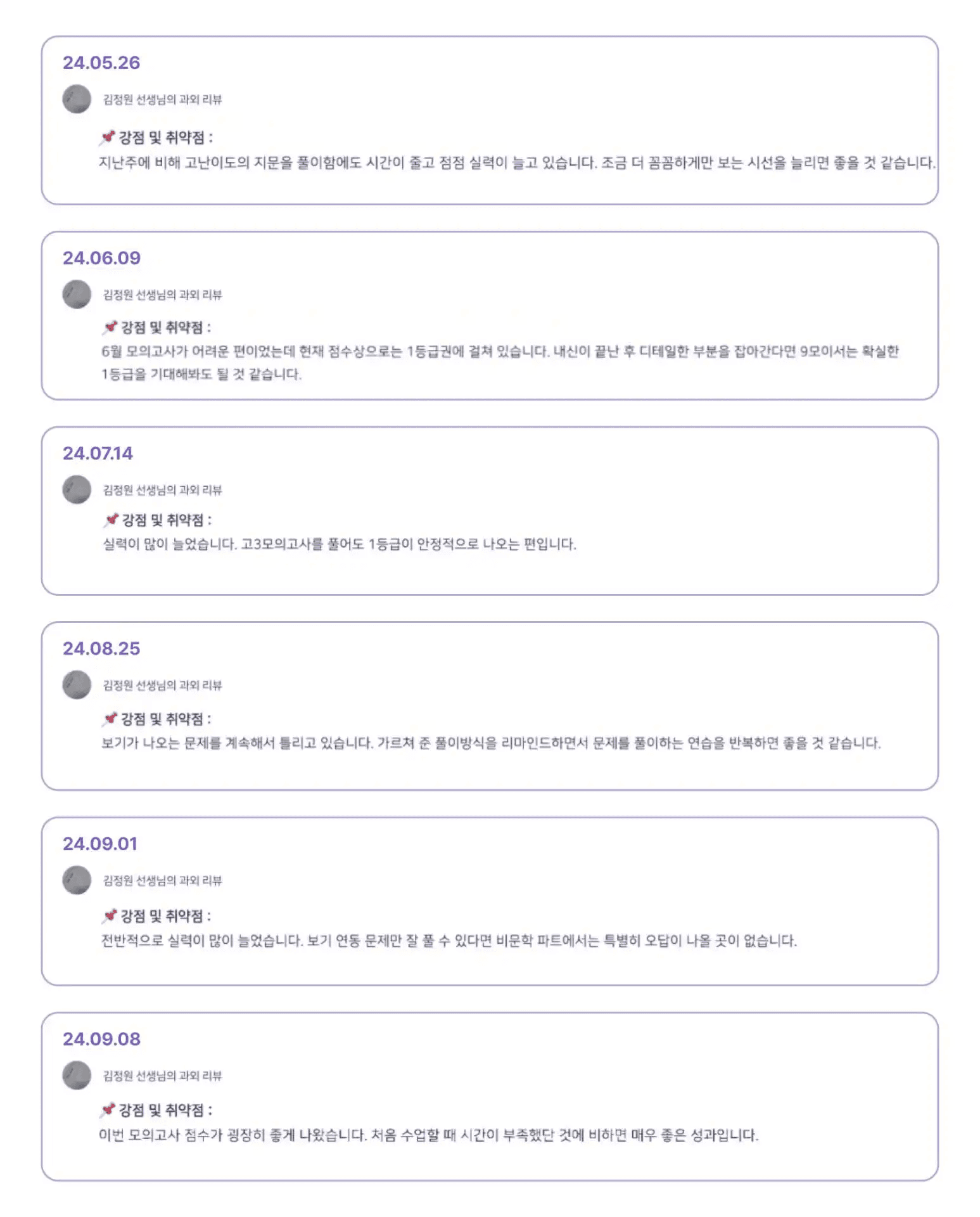 정원 쌤의 과외 리뷰. 설탭 과외 시작 후 몇 달간의 윤지의 변화를 확인할 수 있어요.