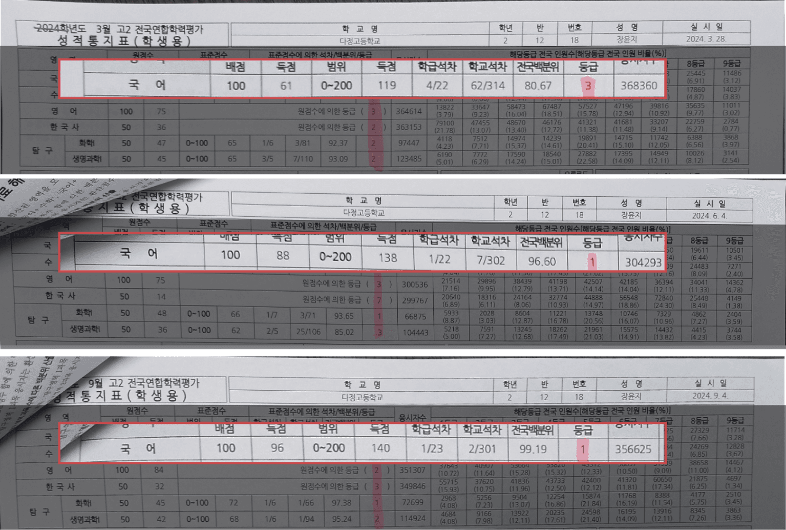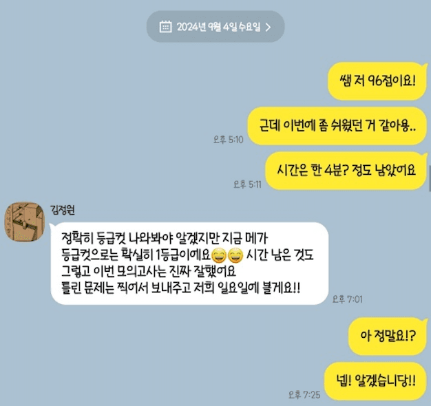 국어에 진심인 선생님과 국어 공부에 진심인 학생이 만나 완성한 결과들. 비단 성적뿐만 아니라 국어에 대한 학생의 마음가짐까지 긍정적으로 변화하여 그 결과가 더 빛이 나는 듯했습니다.