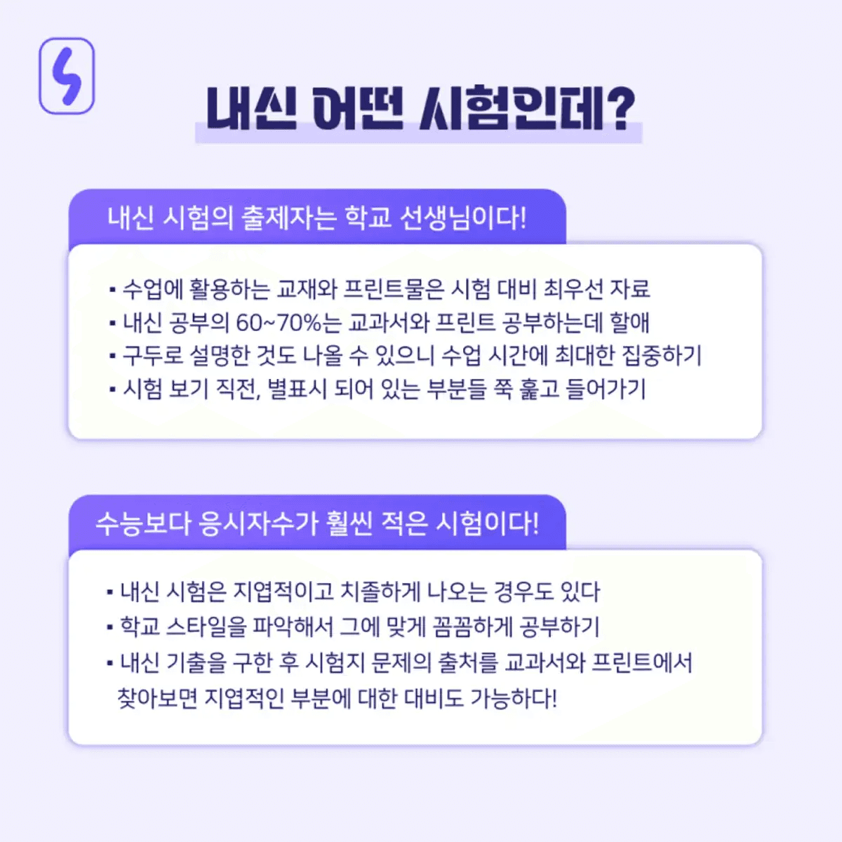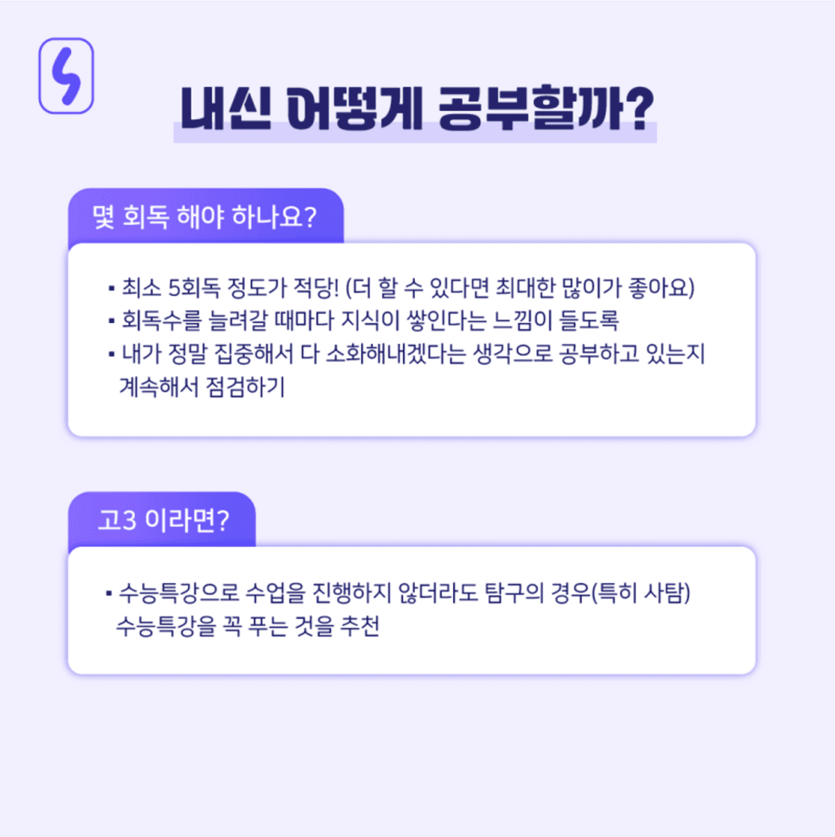 위와 같은 이유로 고 2, 3학년의 경우라면 내신 공부법, 그중에서도 내신 1등급 공부법을 고민할 때 자신이 그동안 치러왔던 내신 시험의 스타일을 분석해 꼼꼼하게 공부하는 것이 좋습니다. 1학년이라면 선배들을 통해서 출제 경향에 대해 들어보고 내신 기출 시험지를 구하는 노력을 통해 학교와 담당 과목 선생님의 시험 스타일을 분석해 보는 것이 좋습니다.