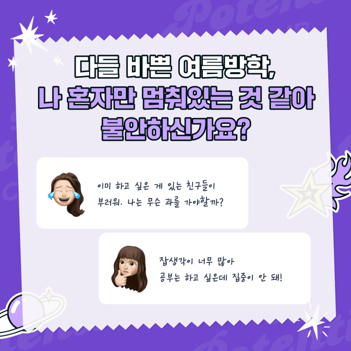 설탭은 이 지치고 힘든, 하지만 그 어느 때보다 중요한 여름방학 시기의 학생들에게 응원의 메시지를 꼭 전달하고 싶었습니다. 바로 포텐셜 클럽의 일환인 ‘동기부여 토크 콘서트’로 말이죠.