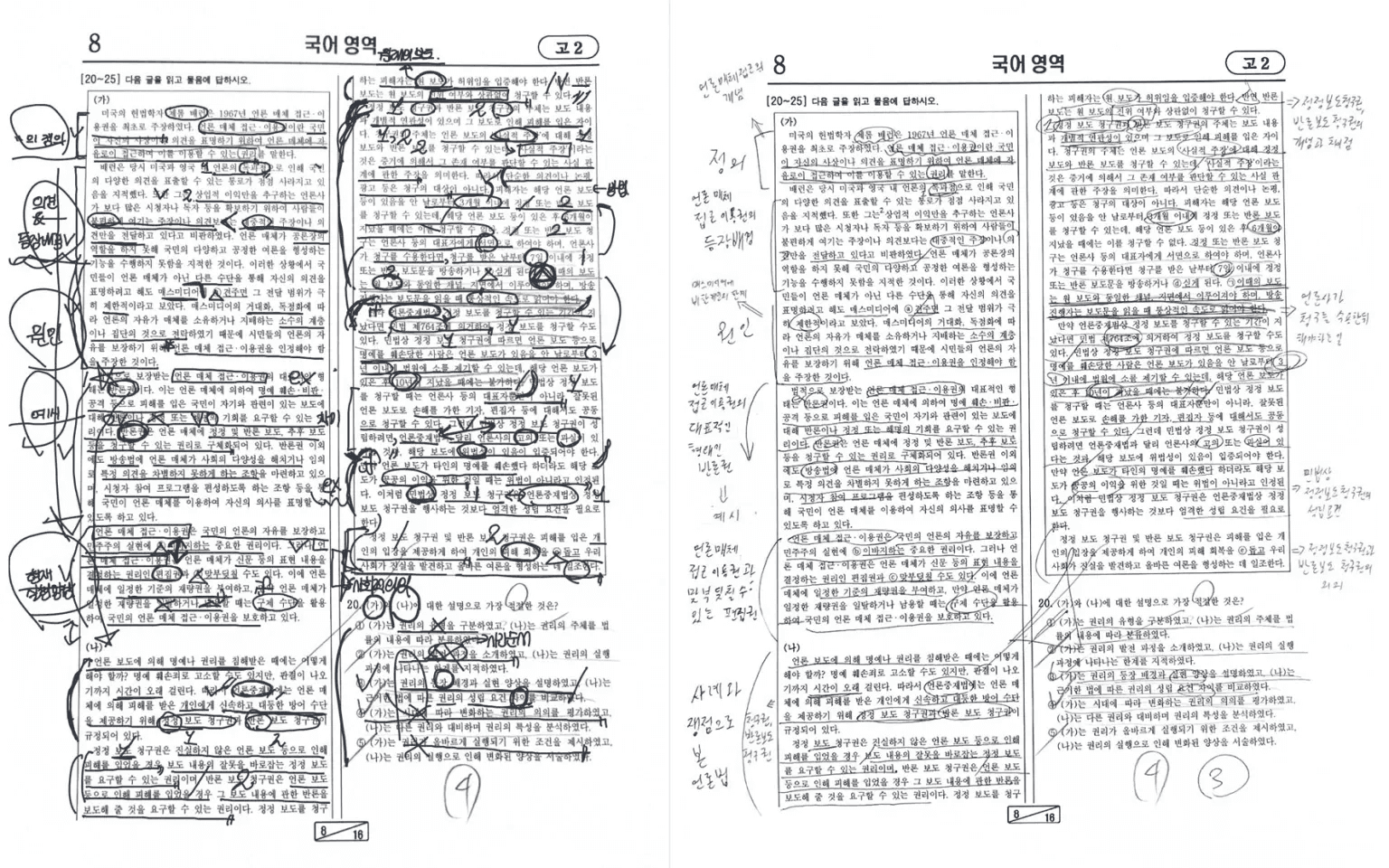 효원 쌤: 처음엔 개념 위주로 수업을 했다가 요즘엔 문제 풀이 위주로 하고 있어요. 독서, 비문학 문제를 따로 풀게 한 다음 일주일에 한 번 종합으로 모의고사를 풀어서 점수를 확인하고 틀린 문제를 고치는 식이죠. 어떻게 문제를 풀어야 하는지 알려주고 약점을 보완해 나가고 있어요.