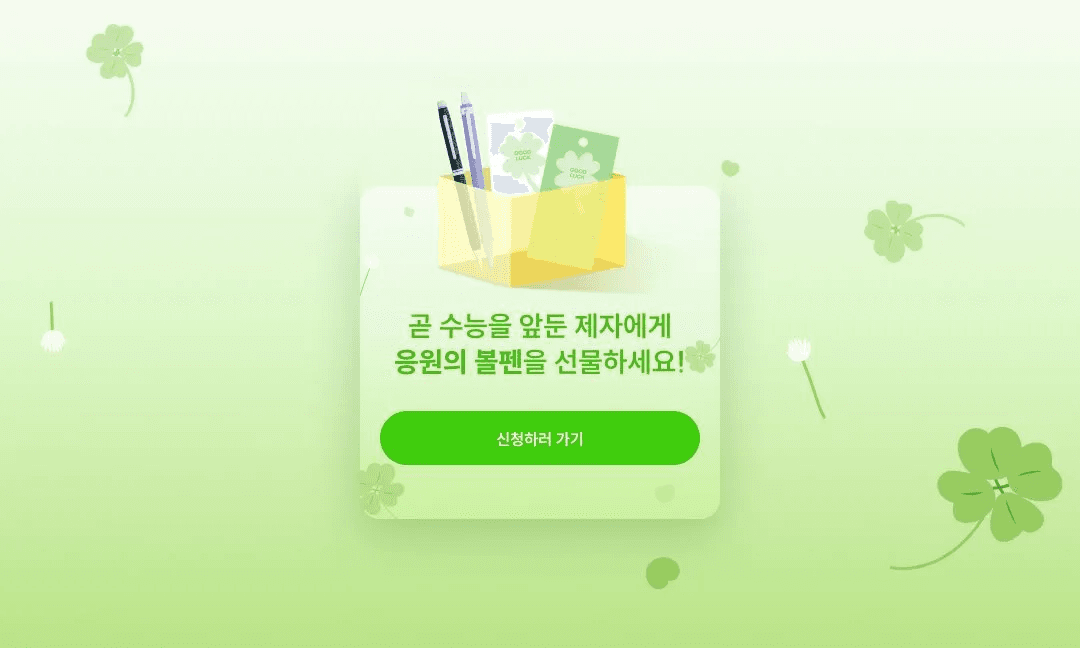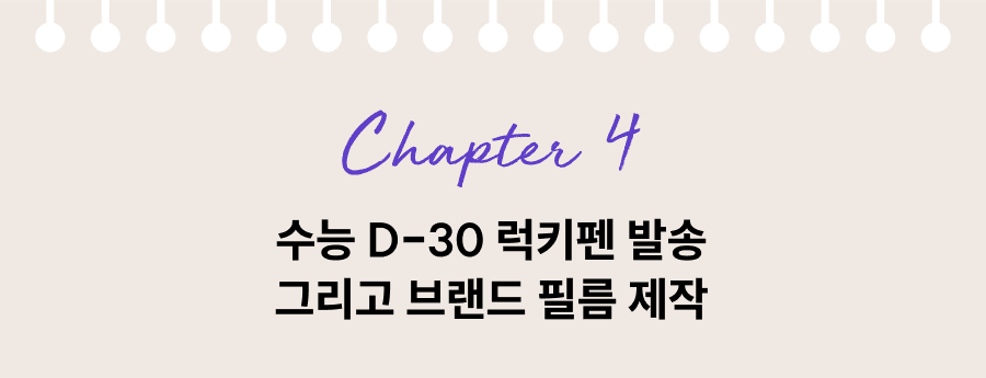 수능 30일을 앞두고 학생들에게 럭키펜을 일괄 발송했다. 무엇보다 중요한 것은 이벤트가 절.대. 학생들에게 노출되지 않도록 비밀을 유지할 것.