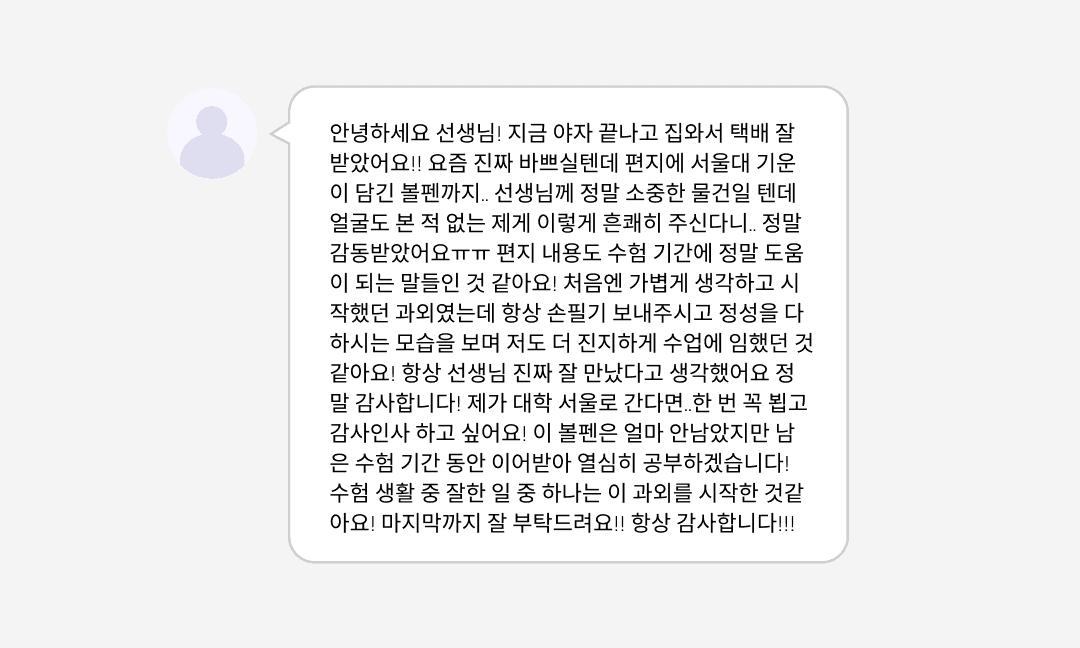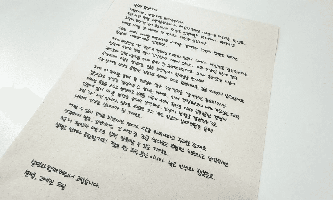 그렇다면 우리 학생들에게도 ‘그동안 함께 공부해 온 과외 선생님이 의미를 담아 준비한 선물이면 좋겠다’는 의견이 나왔다. 단순히 함께 공부만 하는 것을 넘어, 막막하고 불확실한 미래를 함께 고민하고 친밀한 관계에서만 얻을 수 있는 선생님의 정서적 지지가 학생에게 필요한 시점이었기 때문이다. 그리고 선생님의 마음을 담은 선물이라면 마치 8번 공처럼 학생들에게 실로 큰 힘이 될 것이라 믿었다.