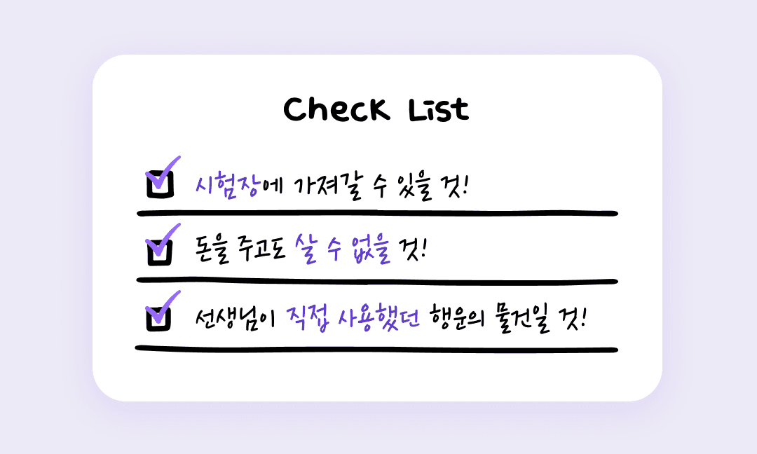 그런 의미에서 우리가 이번 캠페인에서 무엇보다 꼭 고수하고자 한 것은 다음과 같았다. 시험장에 가져갈 수 있을 것, 돈을 주고도 살 수 없을 것, 그리고 선생님이 직접 사용했던 행운의 물건일 것!