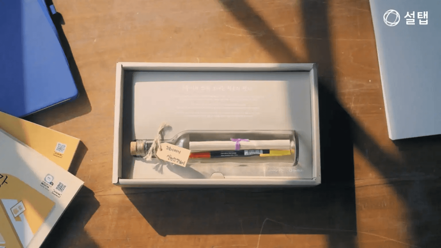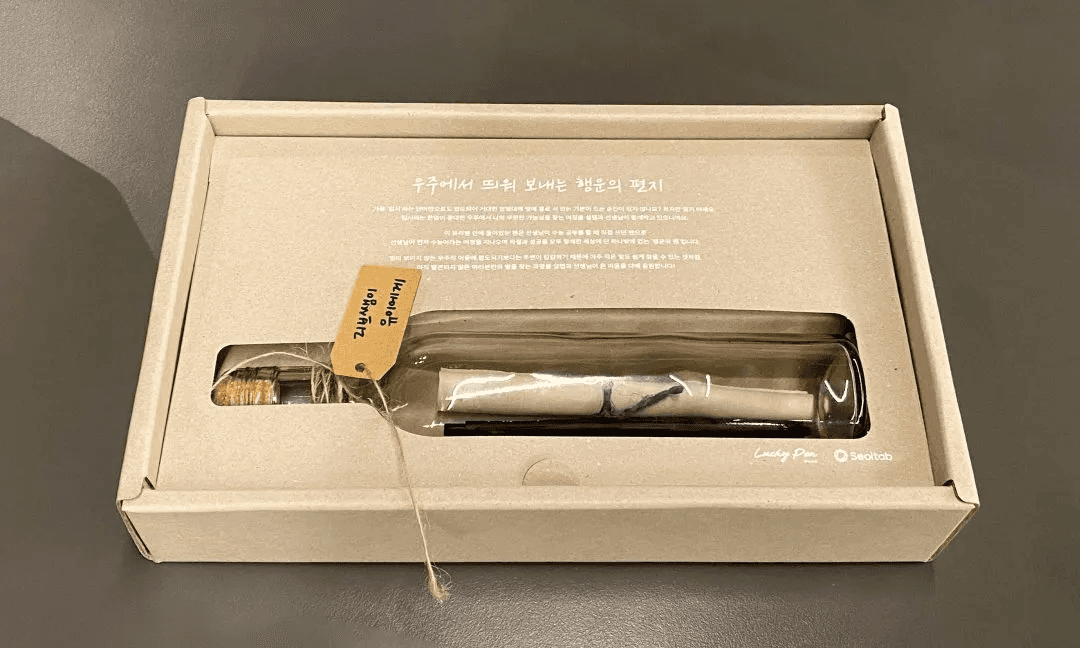 그 순간에 설탭이 개입하면 안 된다고 생각했어요. 그래서 설탭의 로고나 메시지 보다는 유리병과 럭키펜이 가장 먼저 보일 수 있게 하고 모든 인쇄는 눈에 덜 띌 수 있는 화이트 컬러로 정했어요.