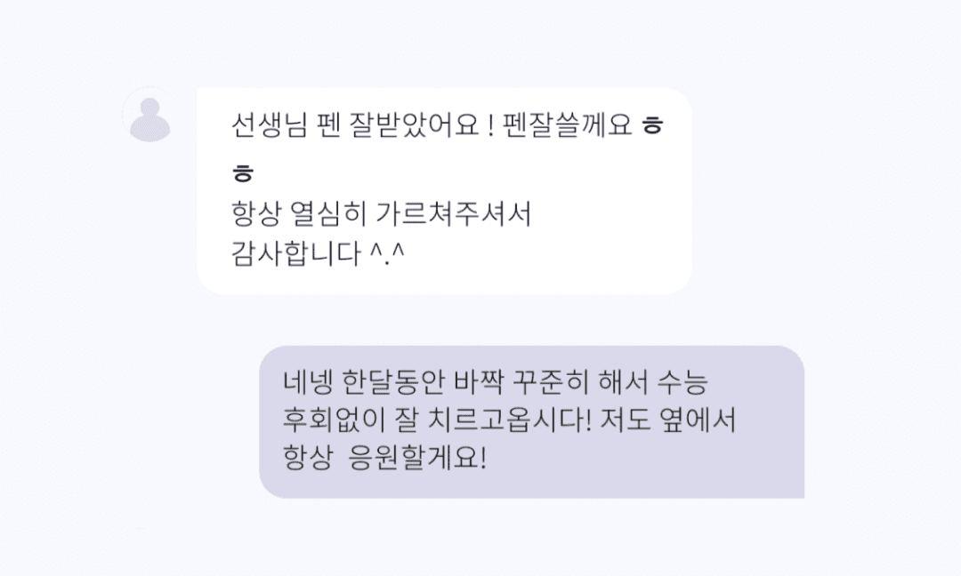 특히 한 선생님은 ‘할 수 있다’는 메시지를 전하며 열심히 해주어 고맙다고 말씀하시면서 살짝 울컥하기도 했는데, 자신이 가르친 학생이 잘되었으면 하는 마음, 행여나 수능 점수에 좌절하지 않을까 걱정하는 마음, 그리고 꿈을 가지고 더 큰 곳을 바라봤으면 좋겠다는 마음이 고스란히 느껴졌어요.