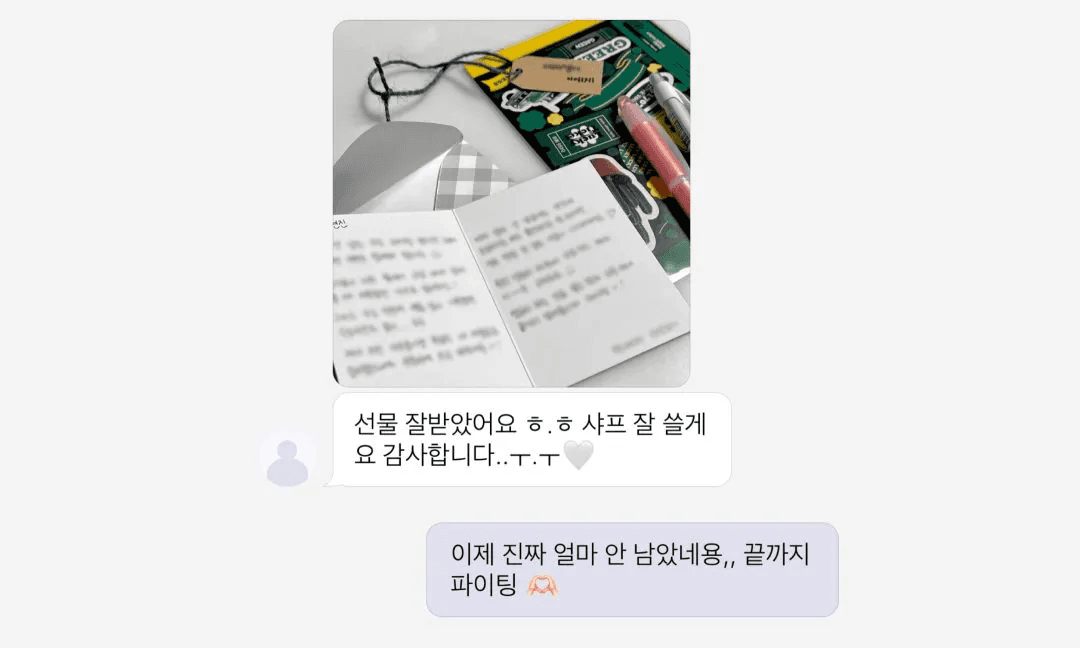 그리고 우리는 학생이 선물을 받은 후에도 이로 인해 공부에 방해 받지 않길 바랬다. 그래서 학생들에게 언박싱 인증사진을 올려달라거나 인터뷰를 해달라는 요청을 전혀 하지 않기로 했다. 오롯이 학생들을 위한 정서적 지지, 서프라이즈! 그거면 충분했기 때문이다.