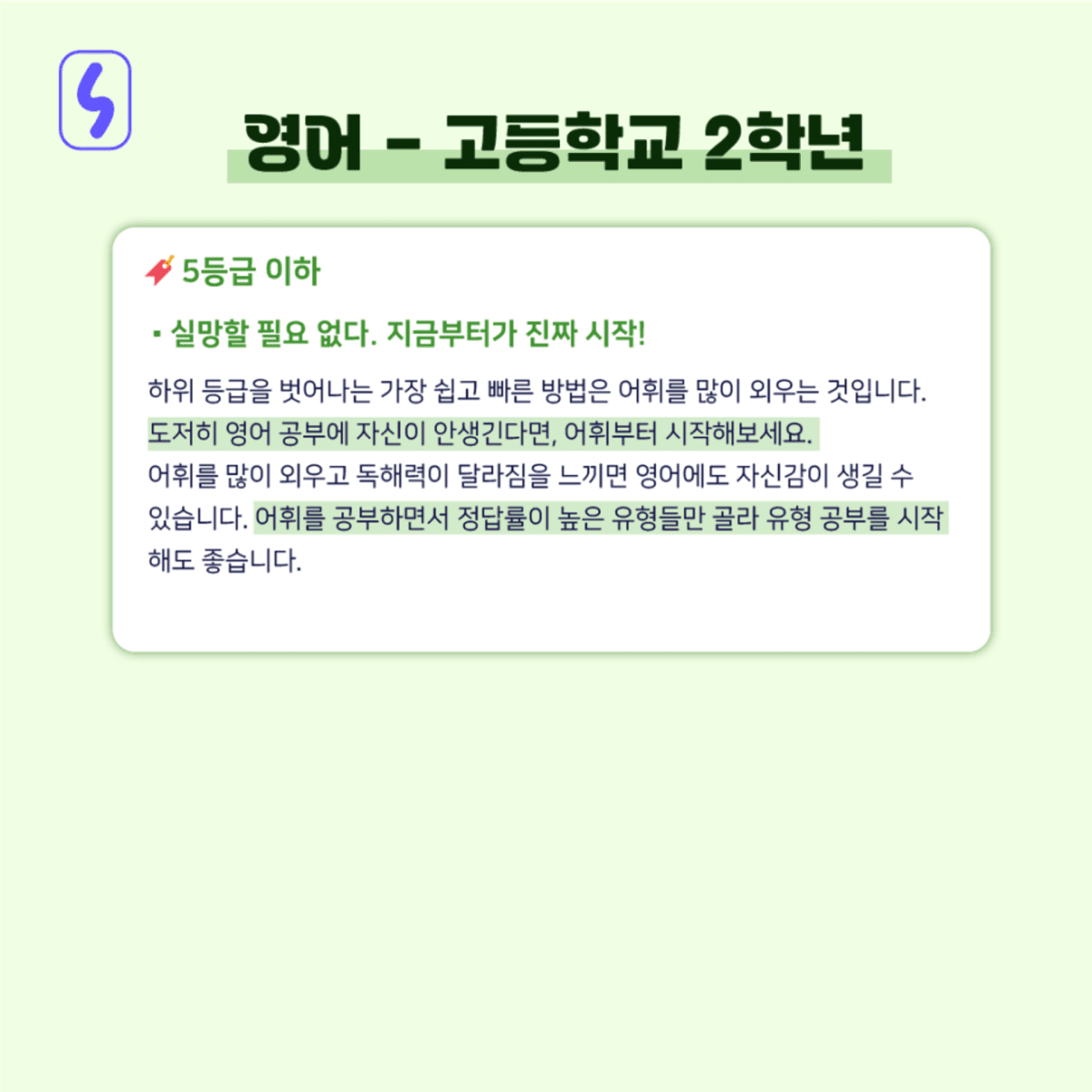 모의고사에서 영어 5등급을 받았다면 큰 실망을 하셨을 것입니다. 하지만 실망하기에는 아직 이릅니다. 영어 모의고사 등급이 하위 등급이라면 우선 어휘부터 다시 공부하시기 바랍니다. 조급하게 생각하지 말고 자신이 하루에 최대한 소화할 수 있는 양의 어휘를 외우는 것이 중요합니다. 공부에는 왕도가 없다고 하지만 영어의 시작은 어휘인 만큼 어휘를 많이 외우고 독해력이 달라짐을 느끼면 영어에도 자신감이 생길 수 있습니다.