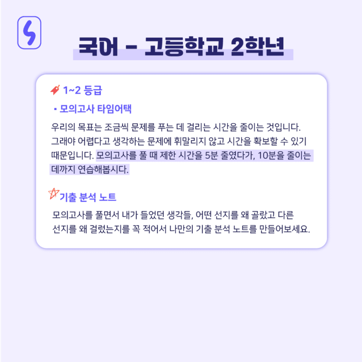 2학년 모의고사 점수를 높이기 위해서는 문제를 풀면서 어떤 부분에서 시간이 오래 걸렸고, 어떤 유형에서 시간이 적게 걸렸는지를 파악하는 것이 매우 중요합니다. 그러니 조금 오래 걸리더라도 모의고사를 풀면서 내가 들었던 생각들이나 어떤 선지를 골랐는지, 왜 다른 선지를 걸렀는지를 다시 리뷰해 보며 나만의 기출 분석 노트를 만들어 보는 것이 모의고사 성적을 올리는 고2 모의고사 공부법이 됩니다.