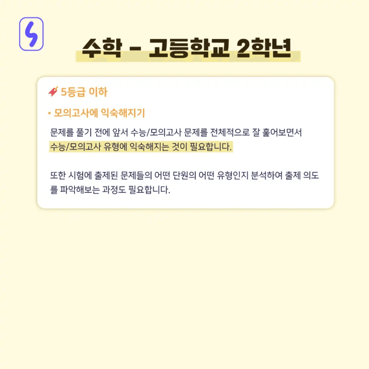 수학에서 5등급을 받았다면 너무 속상해 하지 말고 이제라도 수능과 모의고사 유형에 익숙해지는 연습을 해보시기 바랍니다. 수능이나 모의고사의 경우 학교에서 내는 내신 시험과 문제를 제시하는 방법이나 보기를 제시하는 방법이 다릅니다. 그러므로 고2 모의고사 공부법을 통해 문제를 풀기 전에 앞서 수능/모의고사 문제를 전체적으로 잘 훑어보며 문제에 익숙해져야 합니다. 또한 모의고사는 시중 문제집처럼 단원명, 유형이 명시되어 있지 않고 어떤 개념, 공식을 써야 하는지도 알 수 없기에 시험에 출제된 문제들이 어떤 단원의 어떤 유형인지를 분석하는 방법으로 출제 의도를 파악해 보는 공부법을 실행해 나가시기 바랍니다.