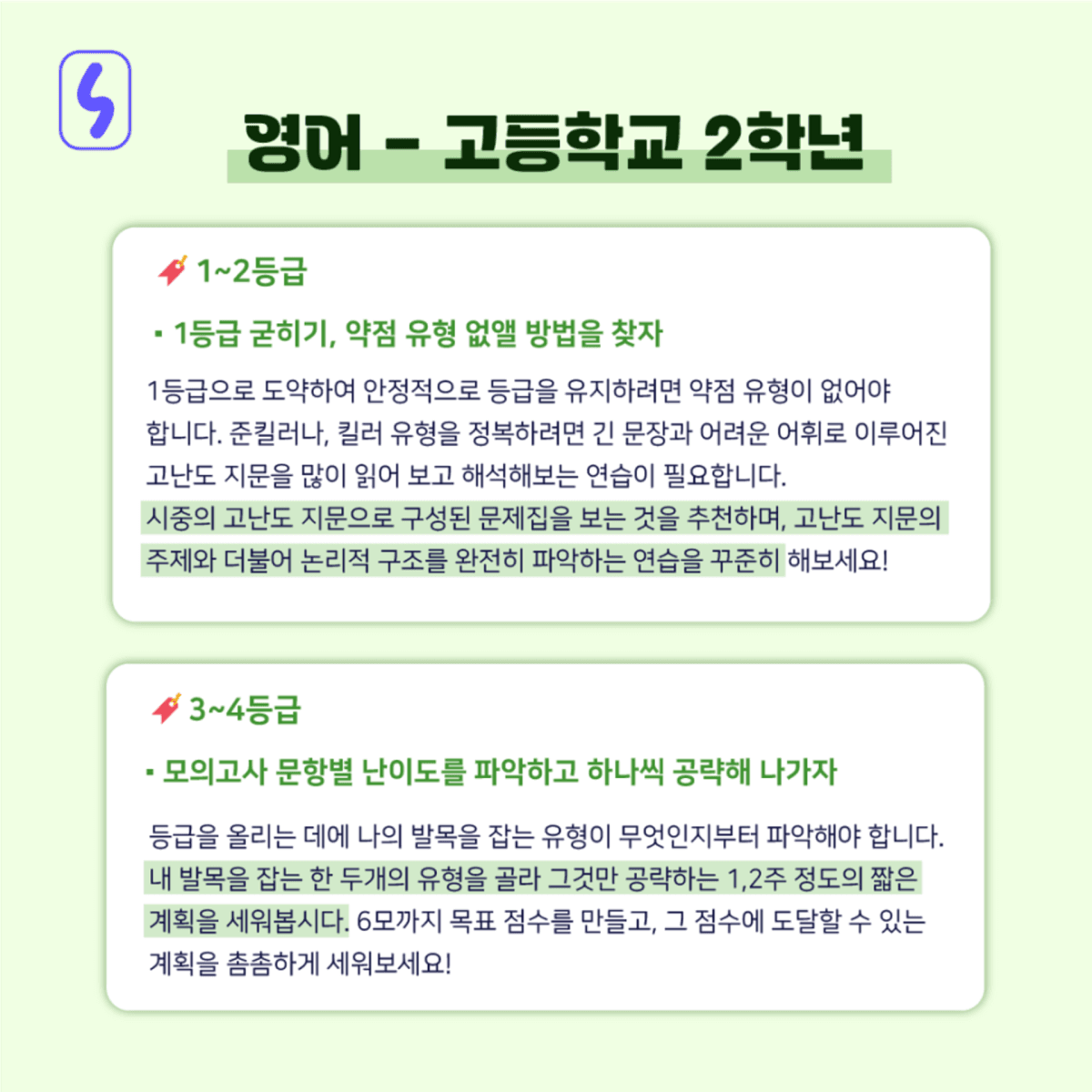 고2 3월 모의고사에서 3~4등급을 받은 학생은 등급을 올리는 데에 나의 발목을 잡는 유형이 무엇인지 먼저 파악해야 합니다. 영어는 절대평가이기 때문에 69점, 79점으로 아깝게 등급이 갈린 상황이라면, 좀 더 세밀하고 체계적인 전략을 세워 과목별 공부법을 실행해야 합니다.