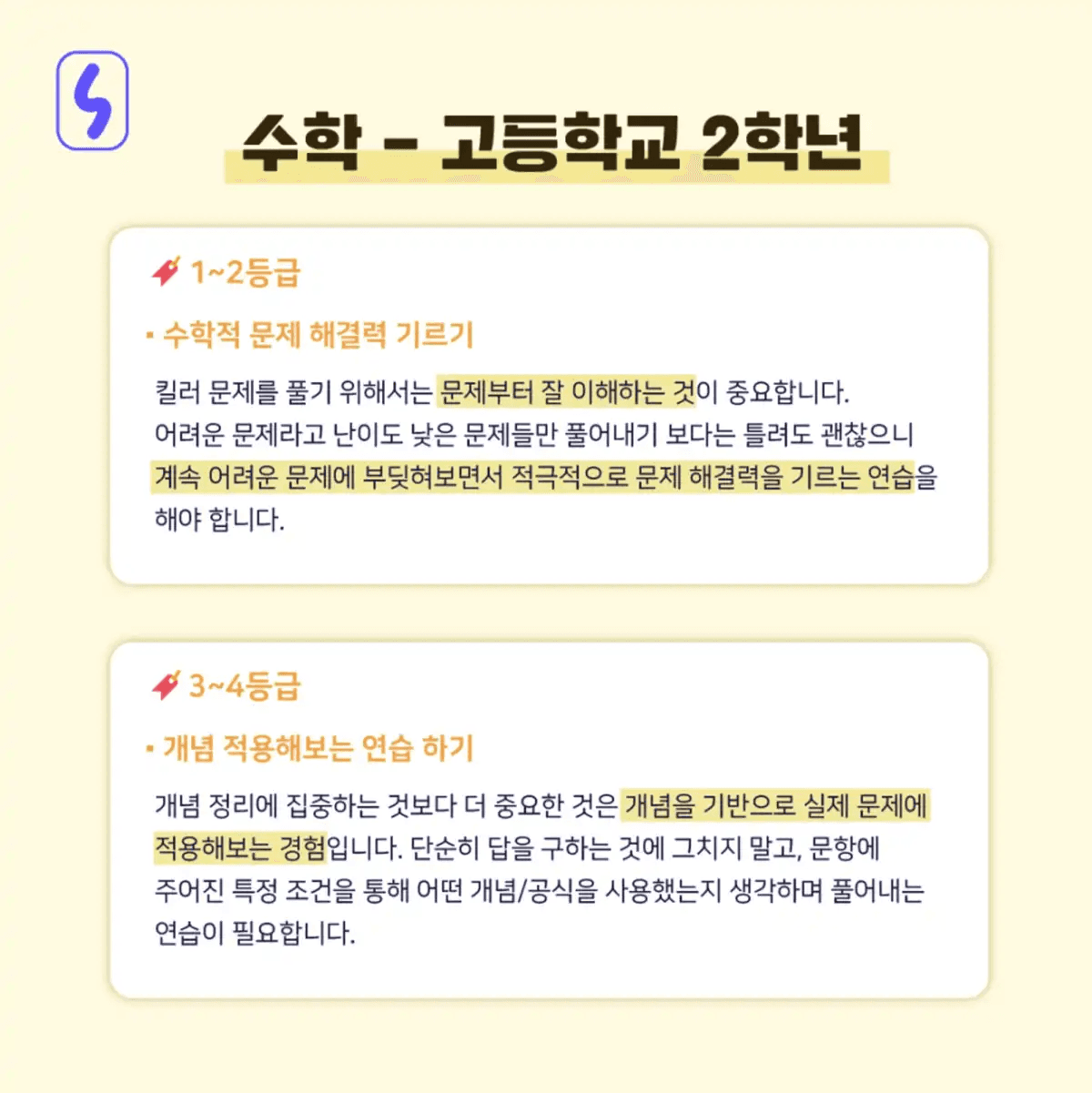 고2 3월 모의고사 수학 등급이 3~4등급이라면 개념을 기반으로 실제 문제에 적용해 보는 경험을 많이 해야 합니다. 이때 2학년 모의고사 점수를 올리려면 단순히 답을 구하는 것에 그치지 말고, 문항에 주어진 특정 조건을 통해 어떤 개념/공식을 사용했는지 생각하며 풀어내는 연습을 하는 공부법을 실천해야 합니다.