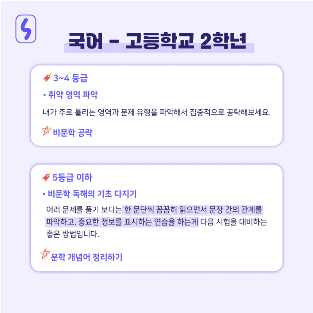 모의고사 등급이 5등급 이하라면 문학 개념어에 대한 기초가 부족해서 간단한 문제도 놓치거나 겁을 먹고 해석하지 못하는 경우가 있습니다. 그렇기에 이때는 기초가 탄탄해야 어떤 작품이 나와도 스스로 해석할 수 있다는 생각을 가지고, 문학 개념어의 기초를 다지는 전략이 필요합니다.