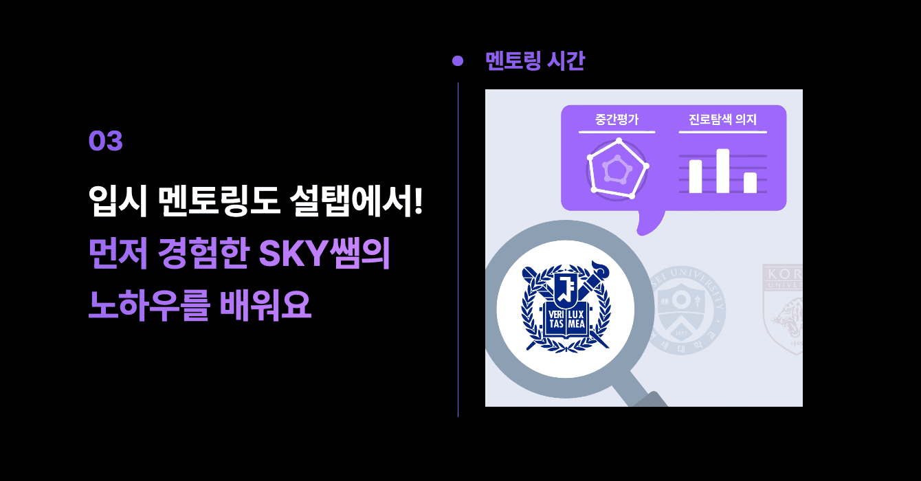 나만의 1:1 멘토와 고민을 나누어 보는 것은 어떨까요? SKY 출신 설탭 선생님과 함께라면 입시 스트레스 관리부터 학습 방향에 대한 대학생 멘토링까지 받을 수 있습니다.