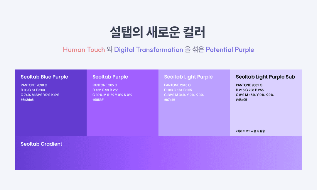 블렌디드 러닝은 HT(휴먼터치)와 DT(디지털 전환)의 결합이에요. 먼저 사람과의 상호작용을 뜻하는 HT는 따뜻한 계열의 컬러이자 심장을 상징하는 붉은색으로, DT는 이성적이고 기술적인 면을 나타내는 블루 컬러로 선정했습니다. 그리고 이 두 가지 컬러를 섞어 설탭의 새로운 컬러를 보라(purple) 색으로 완성했어요. 설탭이 최적의 공부법으로 HT와 DT를 결합한 블렌디드 러닝 방식을 택한 것처럼 컬러 역시 두 컬러를 블렌디드 한 퍼플로 도출한 것이죠.