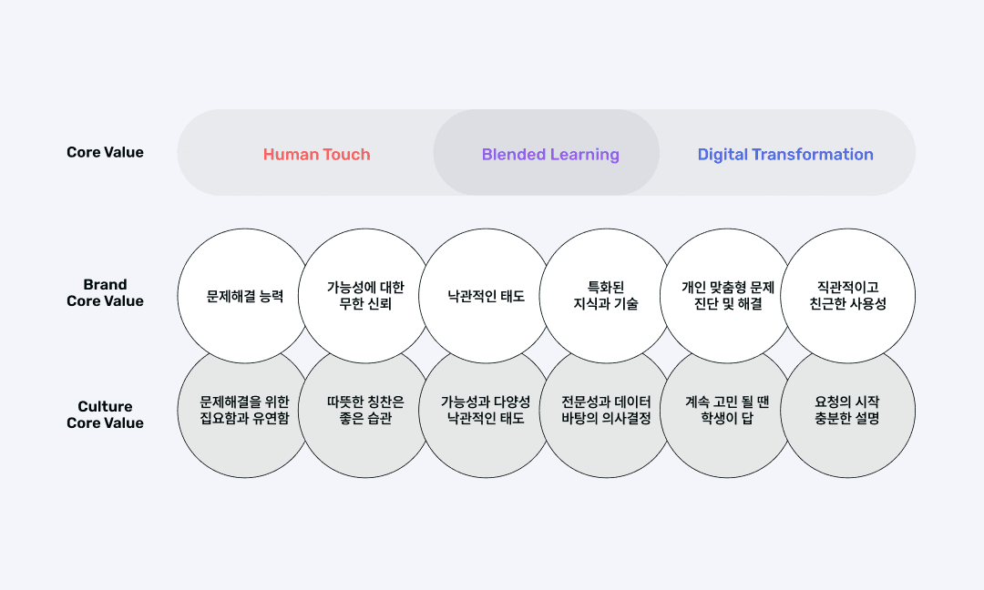 리브랜딩을 통해 정한 철학과 우리가 정한 비전 ‘휴먼터치(HT)와 디지털 전환(DT)을 통한 개인 맞춤형 학습 플랫폼’이 지켜지기 위해서는 브랜드 코어 밸류가 필요합니다.