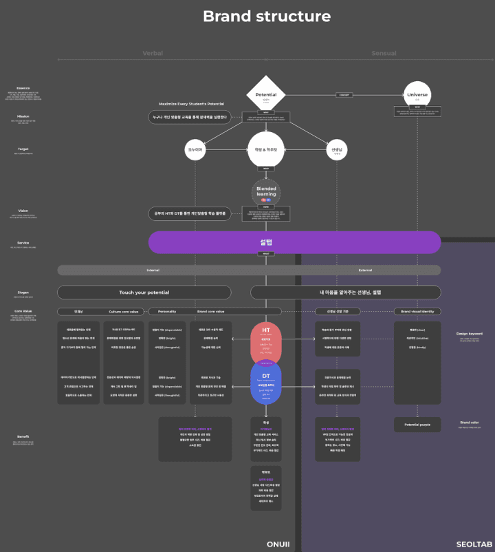 그중 하나인 브랜드 구조도는 설탭의 미션과 비전, 설탭을 구성하는 모든 타깃(학생, 학부모, 선생님, 설탭 구성원)과 그에 따라 세분화한 코어 밸류를 도식화 한 문서입니다. 앞으로 우리는 이 구조도를 바탕으로 사고하고 의사결정하며 같은 목표를 향해 가기로 했어요. 리브랜딩 특집 3편에서 소개한 브랜드 코어 밸류가 바로 여기에 담겨 있습니다.