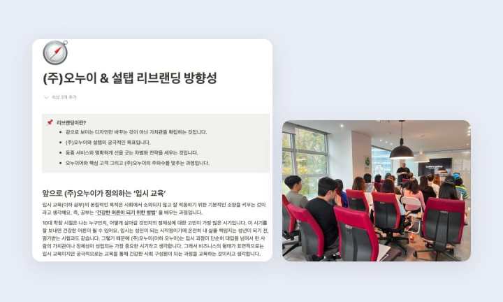 우리가 정한 리브랜딩 방향성을 문서로 정리해 전체 구성원과 공유했어요. 여기엔 앞으로 우리가 정의하는 ‘입시 교육’과 비전과 철학에 대한 논리 구조가 담겨 있어요. 이 내용을 통해 모든 인원이 해당 내용을 바탕으로 우리가 나아가야 할 방향에 대해 인지하도록 유도했습니다.