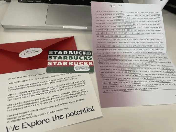 봉투 안에는 브랜딩팀의 메시지와 고객의 사연 스타벅스 상품권이 들어 있었다