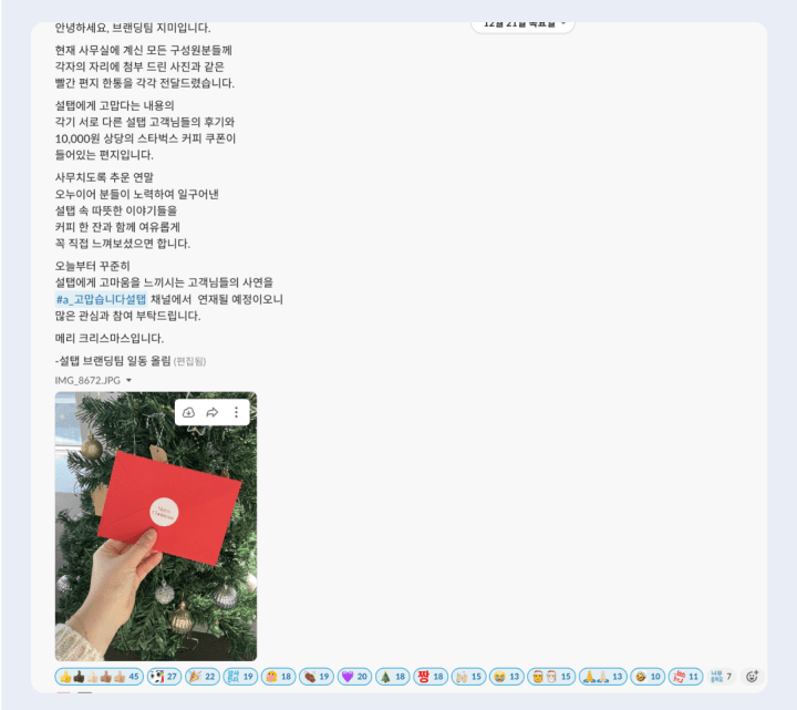 그리하여 총 1,214개 중 설탭의 존재 의의를 대변해 줄 수 있는 내용과 설탭을 통해 도움을 받은 고객의 이야기들로 베스트 사연을 뽑아 편지화하기로 했어요. 각각의 편지에는 120여 명의 구성원 개인의 이름을 손으로 써서 봉투에 담았습니다. 그리고 성탄절을 코 앞에 둔 어느 아침, 출근을 앞둔 구성원들의 책상 위에 이 편지를 올려두었습니다.