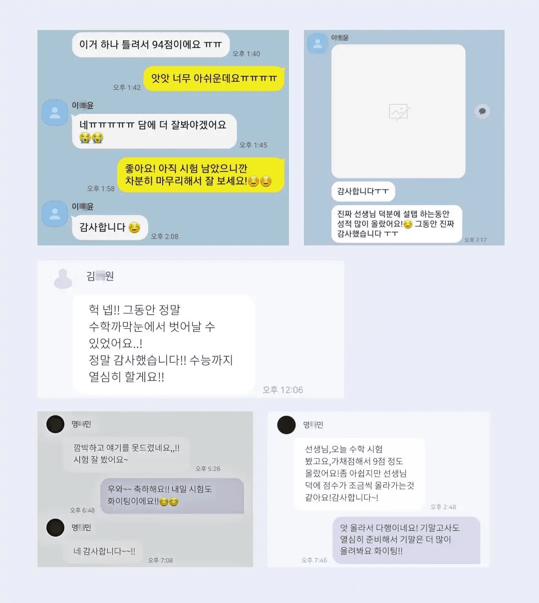 또 현재 수업하는 학생은 1년 반 정도 되었는데요. 처음 시작했을 땐 성적이 60~70점 정도였어요. 그런데 최근 기말고사에서 다 맞았다고 연락이 왔더라고요. 이 친구 역시 평소 열심히 하는 친구라 잘할 거라고 믿었지만 실제로 결과가 좋으니까 뿌듯하기도 하고, 시험이 끝나면 늘 잊지 않고 바로 저에게 연락해 주니 큰 고마움을 느껴요.