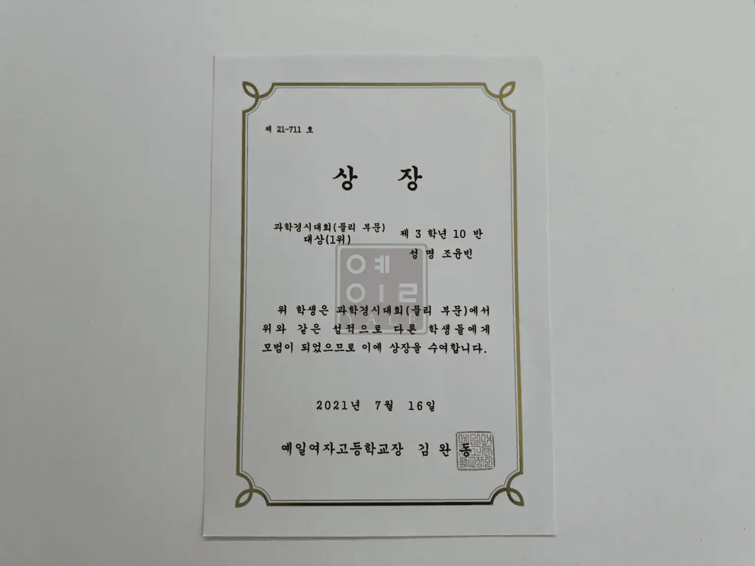 물리경시대회 대상 영광의 상장!