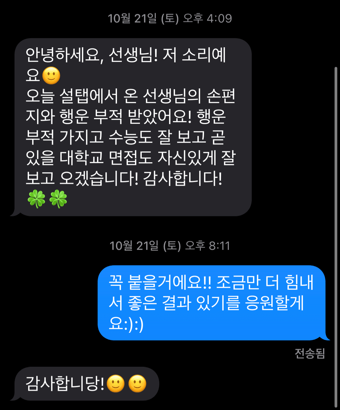 지난해 설탭 럭키펜 이벤트에 참여하고 설탭 학생과 주고받은 메시지