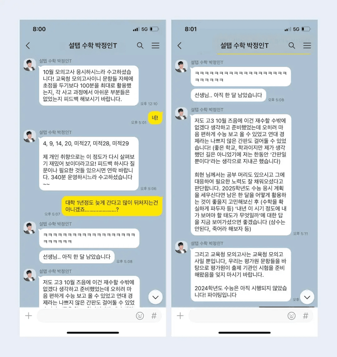 희현: 수능 끝나고 무사히 수능 잘 마쳤다는 말과 함께 한 번 더 도전하고 싶다고 연락을 드렸어요. 쌤도 재수 경험이 있으셔서 많은 조언을 해주셨는데요. 1년이 생각보다 길어서 많은 걸 공부할 수 있을 거라고, 시간 관리나 체력관리는 어떻게 해야 하는지 알려주시면서 용기도 많이 주셨어요. 이렇게 진심으로 조언해 주시는 쌤이 있다는 게 정말 다행이고 설탭하길 잘했다는 생각을 진짜 많이 했어요.