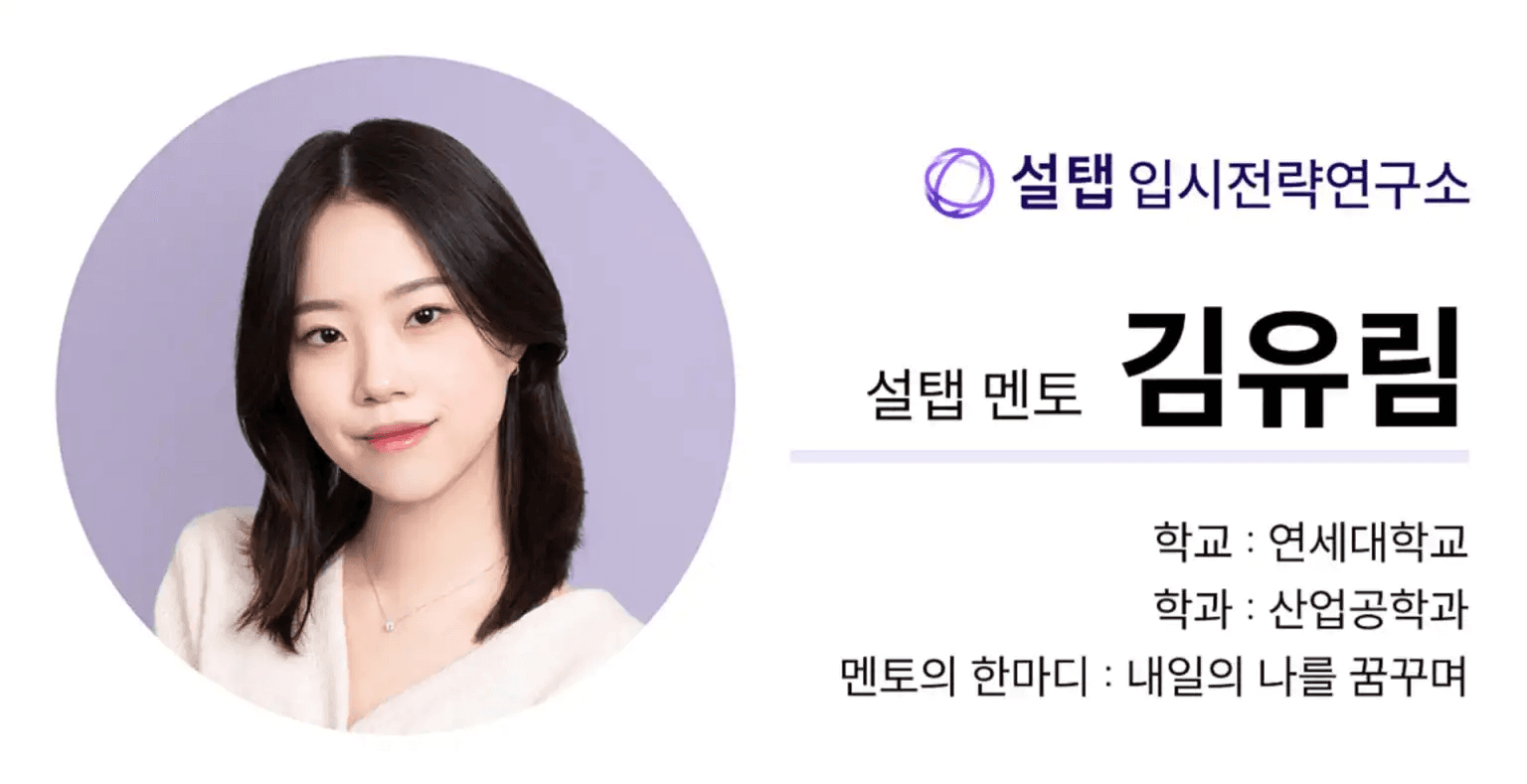 안녕하세요, 연세대학교 산업공학과 22학번 김유림 설탭 멘토입니다.