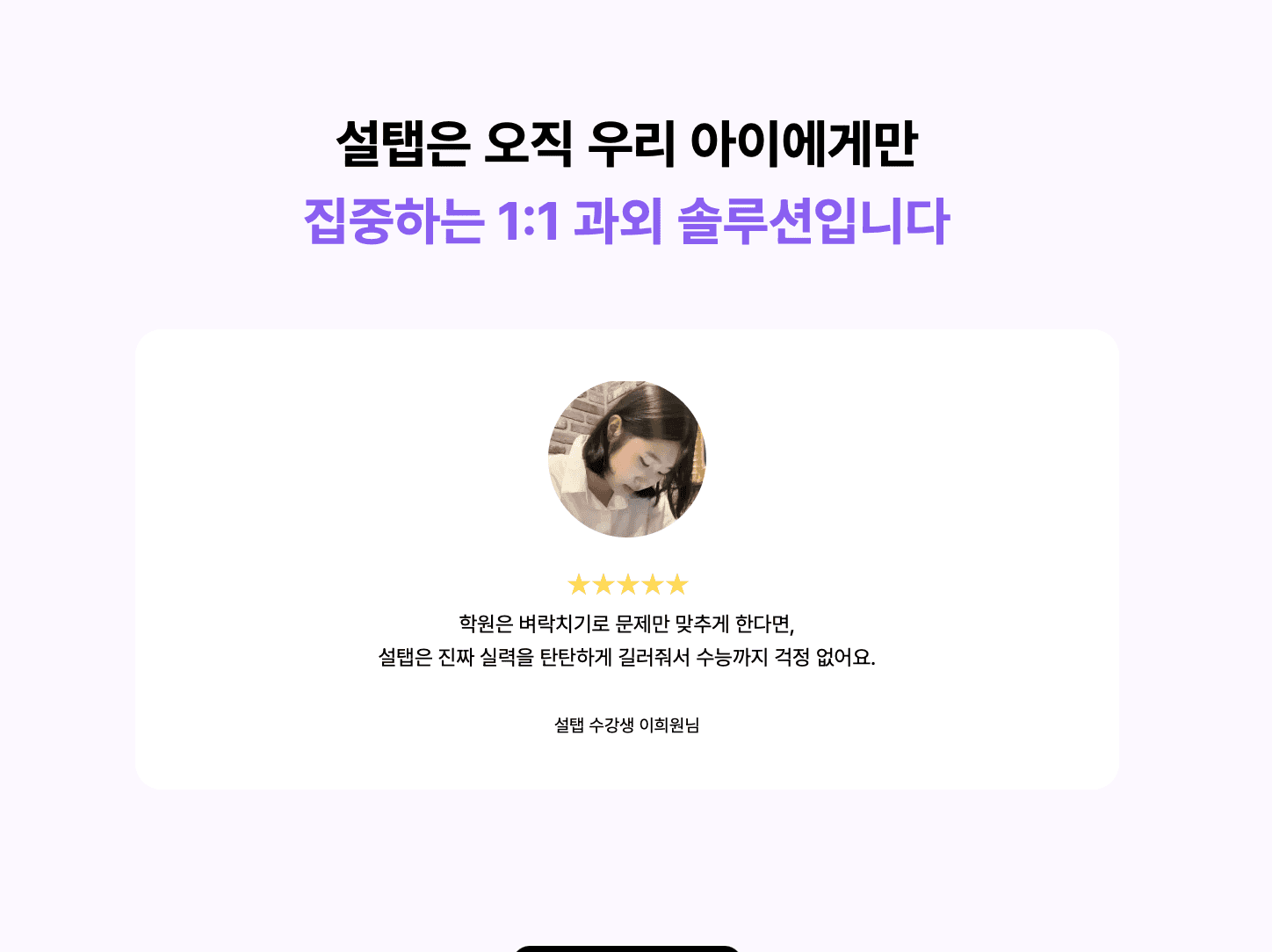 설탭 과외를 시작하기 전에는 잠깐 풀어보고 잘 모르겠으면 바로 선생님께 질문하던 학생도, 설탭을 시작하고 충분한 자기주도학습 시간을 확보한 이후에는 시간을 들여서 문제를 분석하고 풀이과정을 연구하게 되었다고 해요. 예전의 방식처럼 스스로 깊게 생각하지 않고 선생님께 의존해서는 머릿속에 남는 것이 없다는 사실을 깨달은 것이죠. 설탭에서는 오랜 시간 집중력을 유지하며 공부에 몰입하는 습관을 만들 수 있어요.