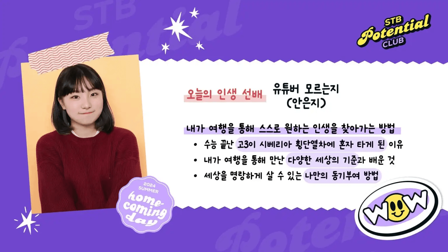 오늘 소개할 인생 선배는 여행 유튜버 모르는지, 안은지 님입니다. (19살, 러시아 횡단열차로 알아낸 도전의 재미 | Potential Club 동기부여 토크 콘서트) 모르는지는 수능이 끝나자마자 시베리아 횡단 열차에 홀로 오르며 그 고군분투 여행기를 유튜브에서 소개해 큰 인기를 모았어요. 그 여세를 몰아 지금까지 특유의 명랑한 에너지로 다양한 도전을 하며 인생을 여행 중이죠.