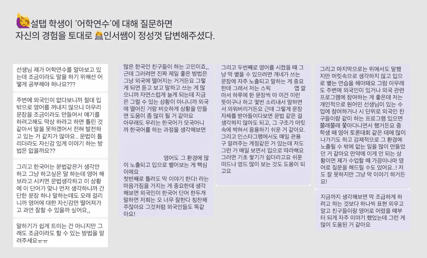 인서 쌤은 2022년부터 지금까지 약 3년간 설탭 학생들을 가르치고 있어요. 자신이 학생 시절엔 경험하기 어려웠던 선생과 학생 사이의 유대감을 느끼며 열심히 수업 중이죠. 그 유대감이 쌓이다 보니 더 좋은 본보기가 되려는 노력이 이어지고 있어요. 인서 쌤은 수업 준비를 더 열심히 하고, 학생도 점점 성실히 숙제도 해오고 수업 시간에도 몰입하면서요.