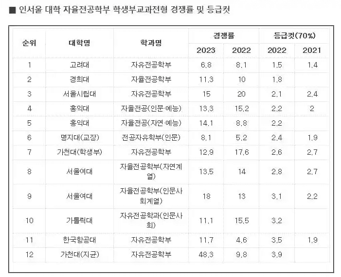 더불어 서울 및 수도권 대학 자유전공학부 가운데 학생부교과전형 등급컷이 가장 높은 대학교 1위는 고려대로 2022학년도 1.5등급이었습니다. 가장 낮은 대학은 가천대학교 지역균형전형으로 3.9등급으로 나타났습니다. 상위 등급컷 2위는 경희대학교로 1.8등급이었으며,  3위는 서울시립대학교로 2.1등급으로 나타났습니다. 4위는 홍익대학교 자율전공 인문계열과 홍익대학교 자율전공 자연계열로 2.2등급이었고, 6위는 명지대학교의 전공자유학부 학교장추천전형으로 2.4등급이었습니다.