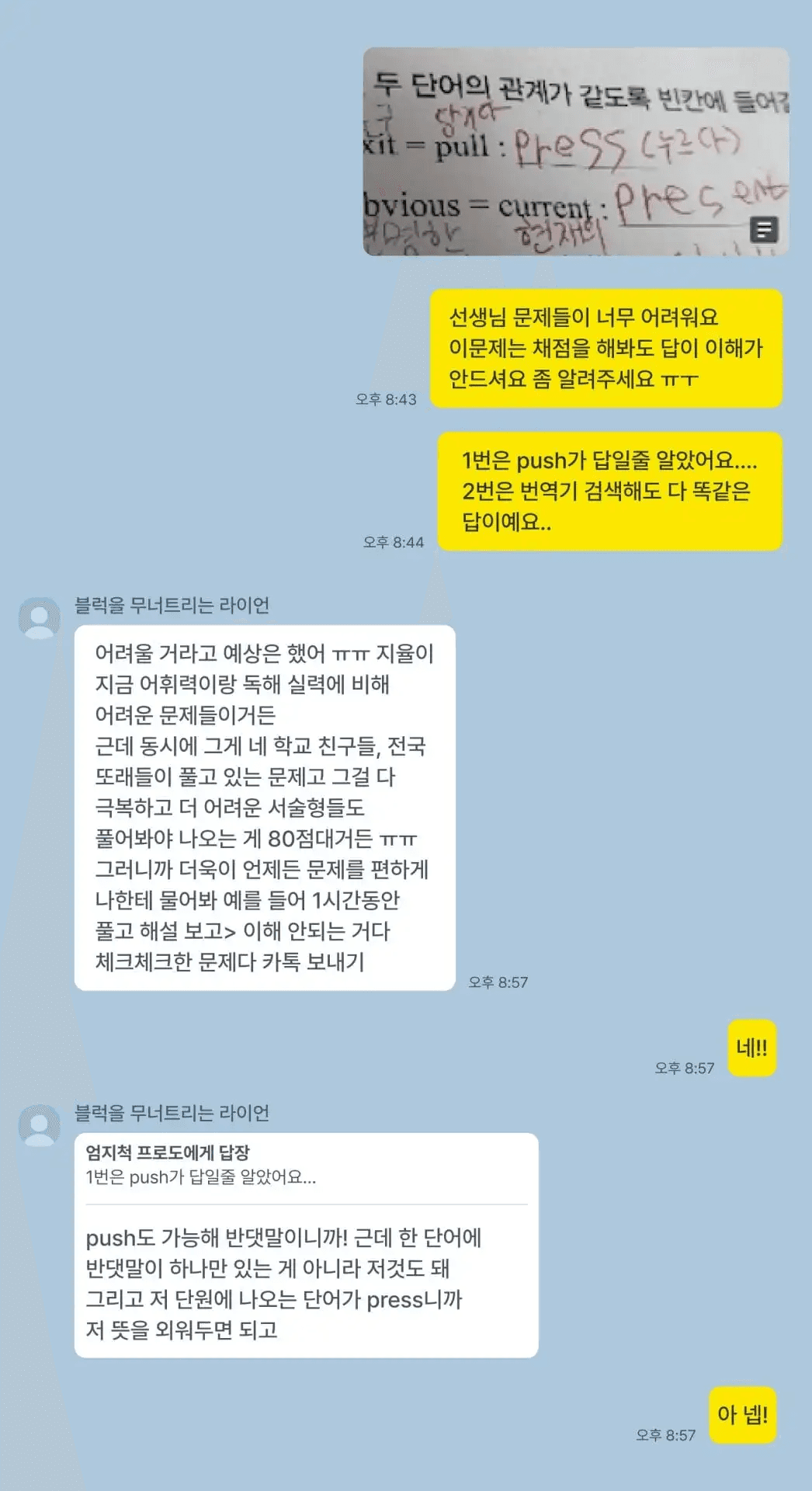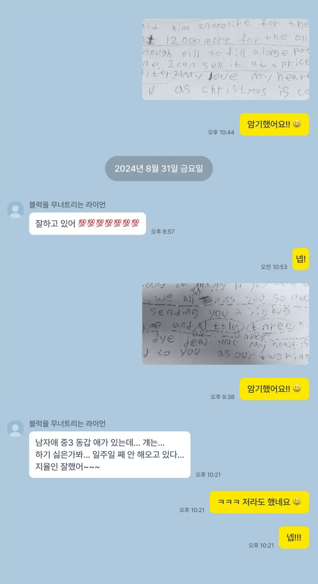 지율 | “시험 끝나면 시험지 사진 찍어서 보내달라고 하시고, 틀린 문제는 꼭 짚어주시면서 비슷한 건 다시 틀리지 않게 꼼꼼히 알려주셨어요. 처음엔 질문하는 것도 어렵게 느껴졌는데, 카톡으로도 모르는 건 편하게 물어보라고 분위기를 유도해 주셔서 점점 질문에 자신감도 생겼어요. 제 스스로도 영어 실력이 늘었다고 느낀 건 이전과 달리 학교 수업을 제대로 이해하게 되었을 때예요. 이제 to부정사 같은 용어를 이해할 수 있어서 수업 참여도도 올라갔어요.”
