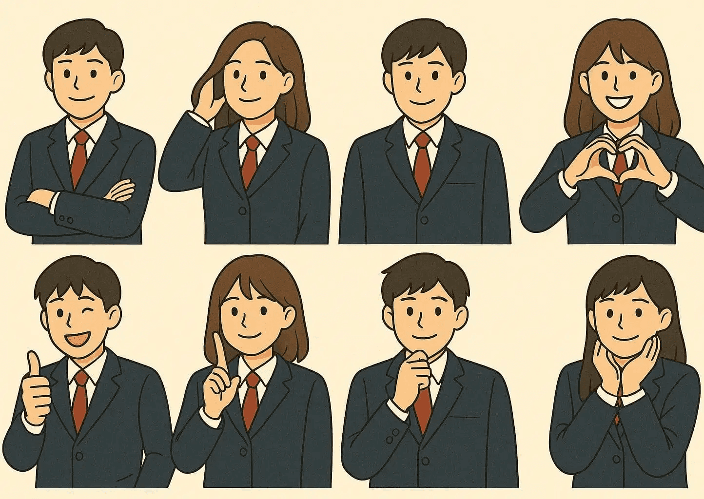 주머니에 손 넣기 | 턱 아래 브이 | 한 손으로 넥타이나 옷깃 잡기 | 한쪽 손을 허리에 올리기 |