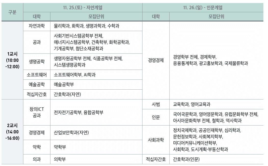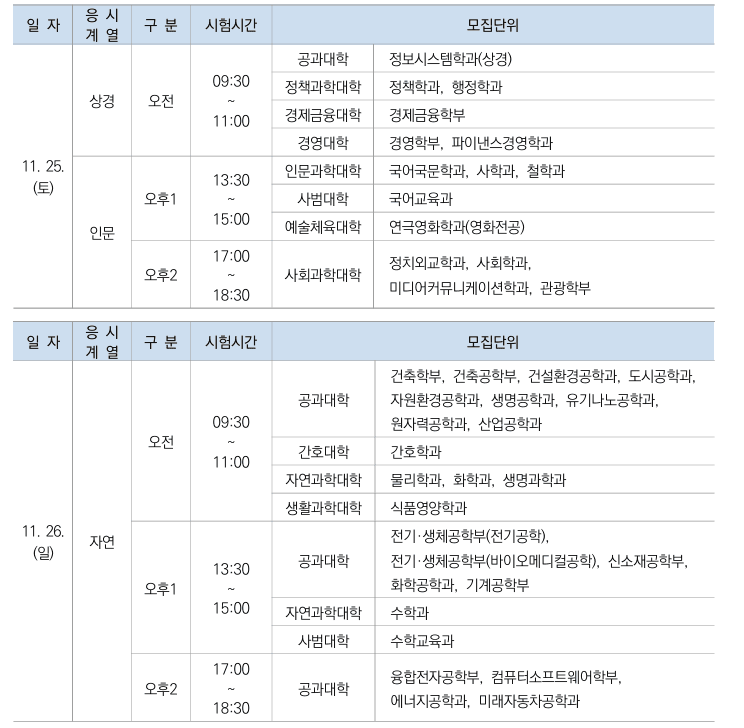 08:00~12:00 : 성균관대-사회과학계열, 경희대-문과대∙생활과학대∙외국어대∙공과대∙체육대, 건국대-인문계열, 숭실대-인문계열