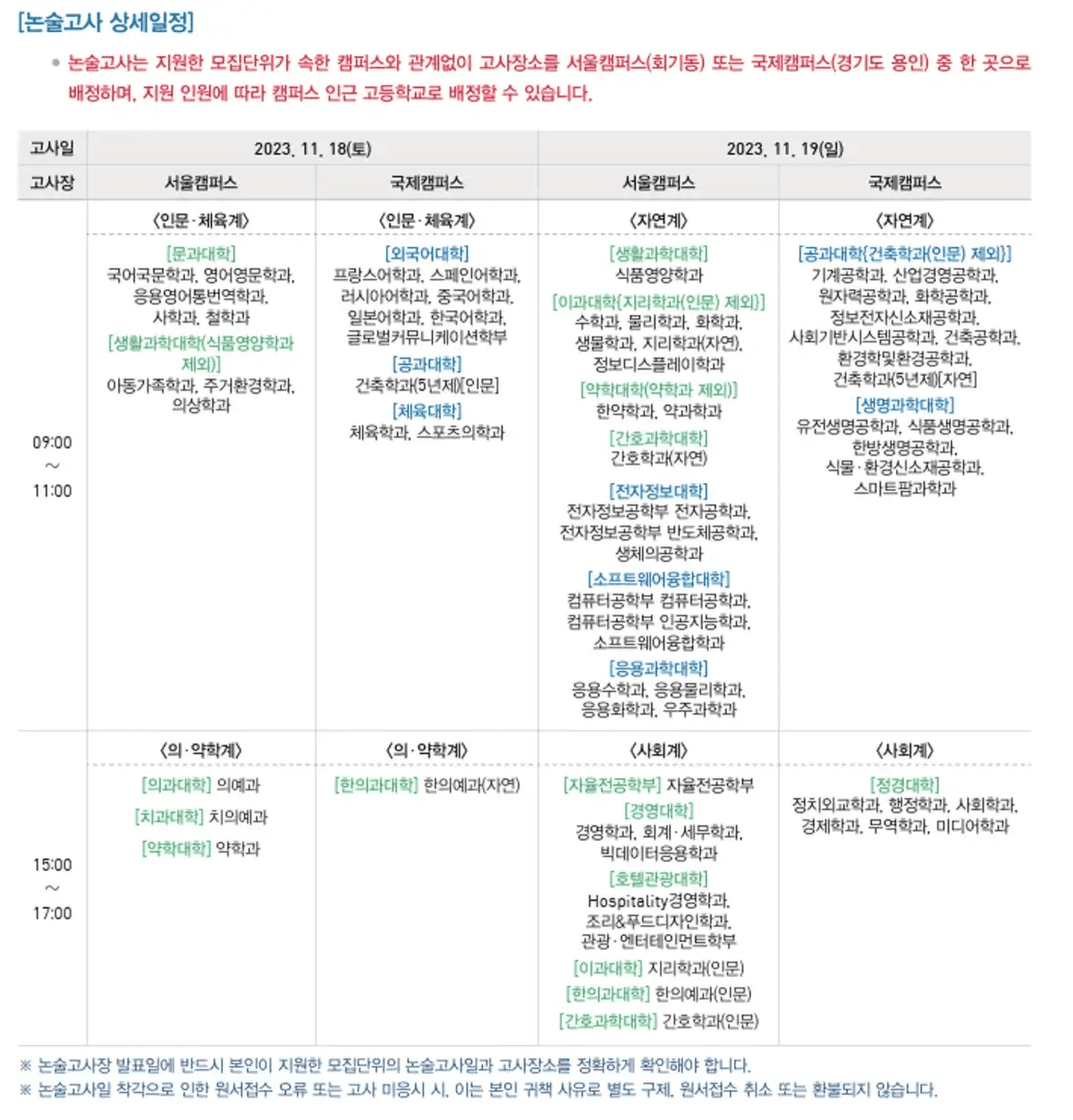 대학마다 논술 고사 일정이 다르기 때문에 미리 대학별 일정을 숙지해야 하는데요. 중앙대학교의 경우 모집 단위에 따라서 시험 일정과 시간이 나뉩니다. 그러나 한양대학교의 경우 계열에 따라 시험 일정이 나뉘는데요. 경희대의 경우 캠퍼스별로 일정이 나뉩니다. 따라서 만일 희망하는 대학들의 논술 일자가 중복된다면 시험 시간이 다른지 확인해 볼 필요가 있습니다. 또한 대학 내부 사정에 따라 일정과 같은 큰 변경 사항이 있을 수도 있으므로, 반드시 논술 고사 응시 전 각 대학 입학처에서 정확한 내용을 다시 한번 확인하시길 바랍니다!