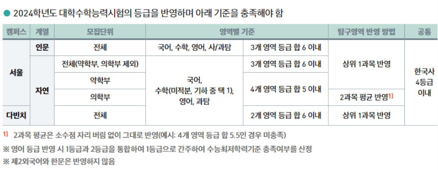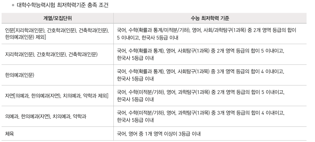 네 번째로 경희대 수시 논술 일정의 경우 계열에 따라 달라지는데요. 서울캠퍼스와 국제캠퍼스의 인문∙체육계와 의∙약학계는 2023.11.18(토)에 예정되어 있으며, 자연계와 사회계는 2023.11.19(일)에 예정되어 있습니다. 또한 전형 방법은 논술 성적 100%이며 최초 합격자 발표는 23.12.15(금) 18:00 시에 예정되어 있습니다. 경희대 수시 논술 또한 수능 최저 기준이 있는데요. 계열마다 수능 최저 기준도 달라지기 때문에 첨부 드린 자료 참고 바랍니다.