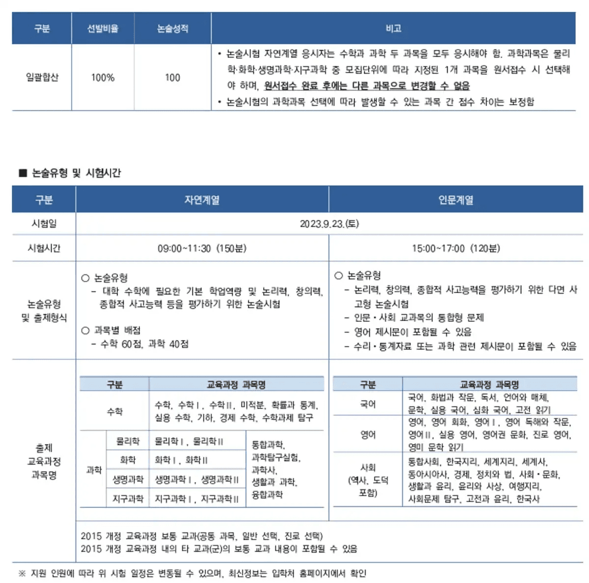 가장 먼저 연세대 수시 논술 일정의 경우 2023.09.23(토)에 진행되었는데요. 최초 합격자는 2023.12.15(금) 18:00시에 발표될 예정입니다. 연세대 논술 시험은 자연계열과 인문계열 두 가지 계열로 나뉩니다. 전형방법은 논술 성적 100%이며, 자연계열 응시자의 경우 수학과 과학 두 과목을 모두 응시해야 합니다. 또한 원서접수 완료 후에는 다른 과목으로 변경할 수 없습니다. 자연계열의 경우 150분간 시험이 진행되었으며, 인문계열의 경우 120분간 시험이 진행되었습니다. 연세대 논술의 경우 14.62 : 1의 경쟁률을 보여주는데요. 가장 경쟁률이 높은 학과는 약학과이며 경쟁률이 가장 낮은 학과는 건축공학과입니다.