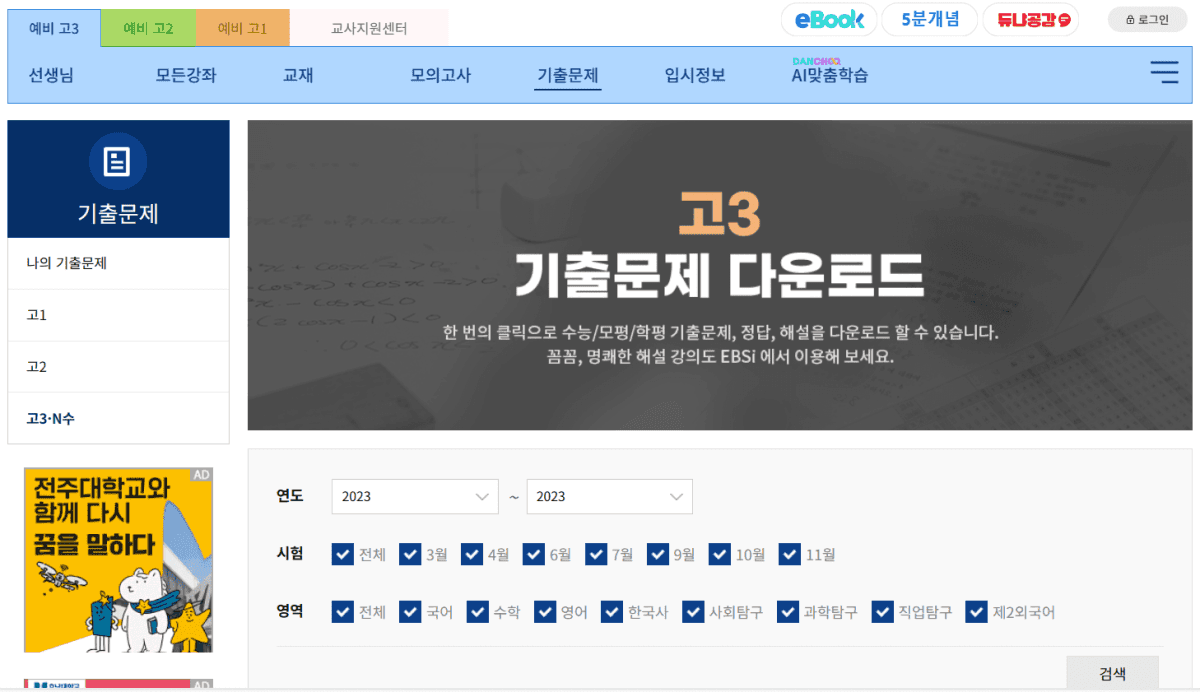 중학교까지는 내신 시험으로 공부하던 국어와 영어 과목이 고등학교의 모의고사에서는 어떤 유형으로 출제되는지 미리 확인하는 것이 중요합니다. EBSi 공식 홈페이지에서 기출문제 탭에서 역대 월별 모의고사를 다운로드할 수 있는데요. 첫 모의고사를 앞두고 계신 분들이라면 직전 해의 3월 모고를 다운로드해 인쇄하거나 태블릿에 넣어서 한번 풀어보시기를 추천합니다.