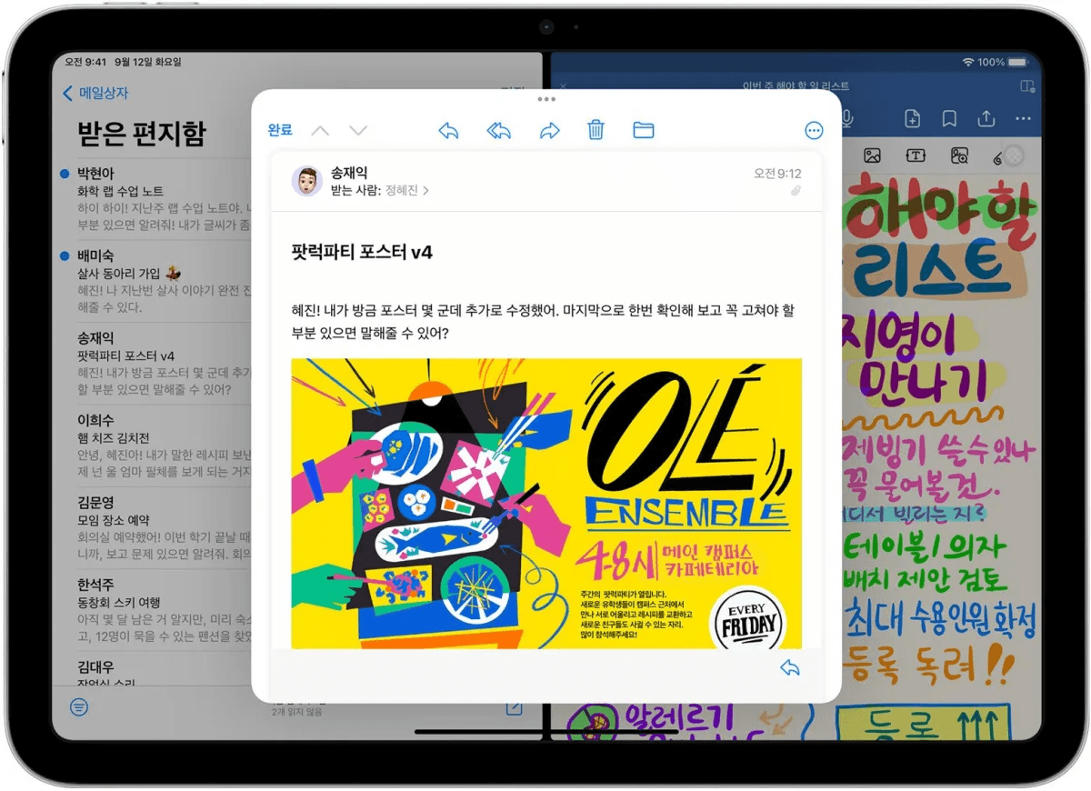 학생 아이패드 추천 기능으로는 스플릿뷰(Split View)와 슬라이드 오버(Slide Over) 기능이 있습니다. 이미지와 같이 팝업 형태로 화면에 앱을 띄워서 슬라이드 오버로 사용할 수도 있고, 화면의 왼쪽과 오른쪽에 각기 다른 앱을 띄워 스플릿뷰로도 사용할 수 있습니다. 스플릿뷰를 이용하는 경우, 왼쪽에는 인강 화면을 오른쪽에는 필기 앱을 띄워 인강을 시청하며 동시에 필기도 할 수 있습니다.