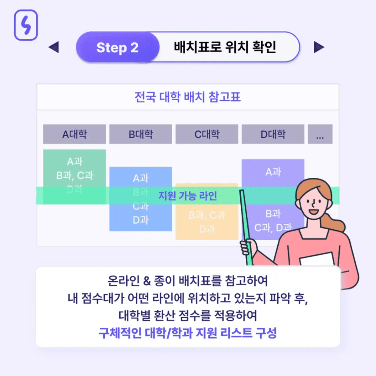 배치표는 절대적인 점수와 합격과 불합격의 행방을 결정해 주지는 못하지만, 대략 내 점수대가 어떤 라인에 있는지 파악하기에는 가장 좋은 자료입니다. 그러므로 대학별 환산 점수를 적용하여 구체적으로 내 점수가 이 대학, 이 전공의 어떤 위치에 있는지 파악해 정시 지원 가능 대학의 리스트를 구성할 수 있습니다. 다만 이 배치표를 제작하는 학원이나 업체에 따라 내용의 차이가 있기 때문에 여러 기관의 배치표를 종합적으로 참고하는 것이 좋습니다.