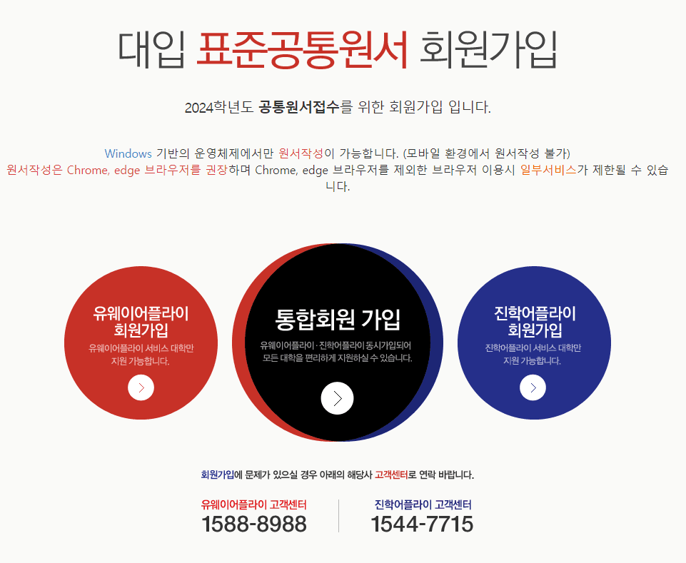 지금부터 정시 원서 접수 방법을 알아봅시다. 정시 원서 접수는 온라인으로 간편하게 진행할 수 있습니다. 정시 지원 수험생은 유웨이어플라이와 진학어플라이 중 지원하려는 대학의 원서접수 대행사를 확인합니다. 대학마다 사용하는 사이트는 다르지만, 통합회원으로 가입하면 두 사이트 모두 이용할 수 있는데요. 따라서 총 3개의 정시 원서 지원을 위해서는 통합회원 가입하는 정시 원서 접수 방법을 추천해 드립니다.
