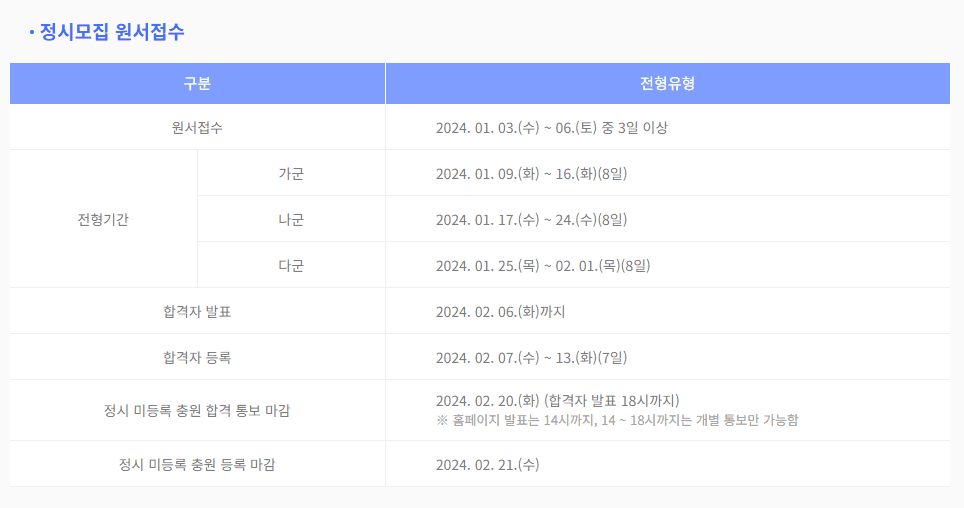 2024년도 정시 원서 접수 기간은 2024년 1월 3일부터 6일 사이에 이뤄지며, 전형유형에 따라 지원 날짜가 상이합니다. 가군은 1월 9일부터 16일까지, 나군은 1월 17일부터 24일까지, 다군은 1월 25일부터 2월 1일까지 각 8일 동안 진행됩니다. 정시 합격자 발표는 2월 6일까지 진행되며, 이후 정시 미등록 충원 합격 통보 및 등록이 이뤄집니다.