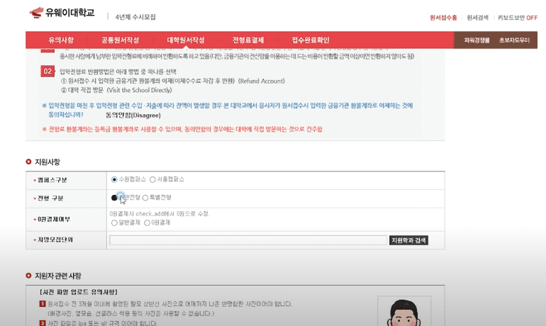 공통원서 작성 이후에는 지원하고자 하는 대학 원서를 작성합니다. 메인화면의 검색창에 대학명을 검색하거나, 메인화면 중앙의 접수 목록에서 대학을 찾아 클릭해도 되는데요. 대학 원서를 작성할 때는 대학별 유의사항, 지원 전형, 모집 단위, 캠퍼스, 지원 학과 등 기본 사항을 꼼꼼히 확인해 주세요!