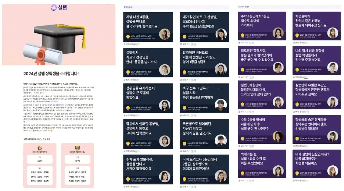 앞으로도 설탭은 학생과 학부모님, 그리고 선생님들께 용기와 희망이 될 수 있도록 최선을 다하겠습니다. 마지막으로 2024년 설탭 장학생으로 선정되시고 자신의 이야기를 공유해주신 20명의 장학생들께 진심으로 감사하다는 말씀을 전합니다!